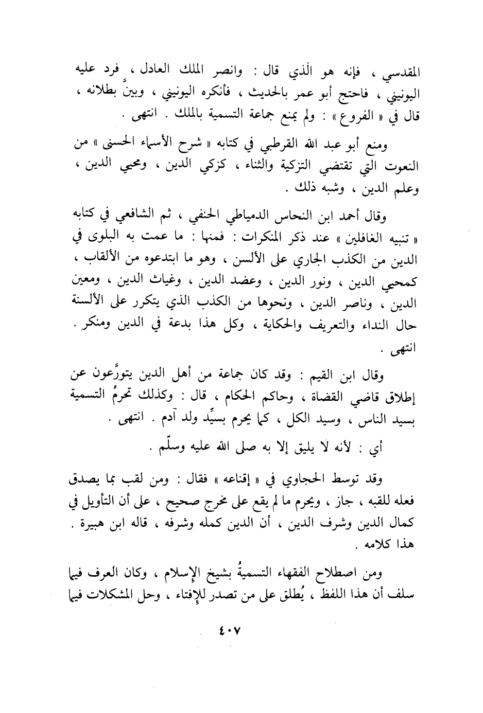 وَمنع أَبُو عبد الله الْقُرْطُبِيّ فِي كِتَابه شرح الْأَسْمَاء الْحسنى من النعوت الَّتِي تَقْتَضِي التَّزْكِيَة وَالثنَاء كزكي الدّين ومحيي الدّين وَعلم الدّين وَشبه ذَلِك وَقَالَ أَحْمد بن النّحاس الدمياطي الْحَنَفِيّ ثمَّ الشَّافِعِي فِي كِتَابه تَنْبِيه الغافلين عِنْد ذكر الْمُنْكَرَات فَمِنْهَا مَا عَمت بِهِ الْبلوى فِي الدّين من الْكَذِب الْجَارِي على الألسن وَهُوَ مَا ابتدعوه من الألقاب كمحيي الدّين وَنور الدّين وعضد الدّين وغياث الدّين ومعين الدّين وناصر الدّين وَنَحْوهَا من الْكَذِب الَّذِي يتَكَرَّر على الْأَلْسِنَة حَال النداء والتعريف والحكاية وكل هَذَا بِدعَة فِي الدّين ومنكر انْتهى