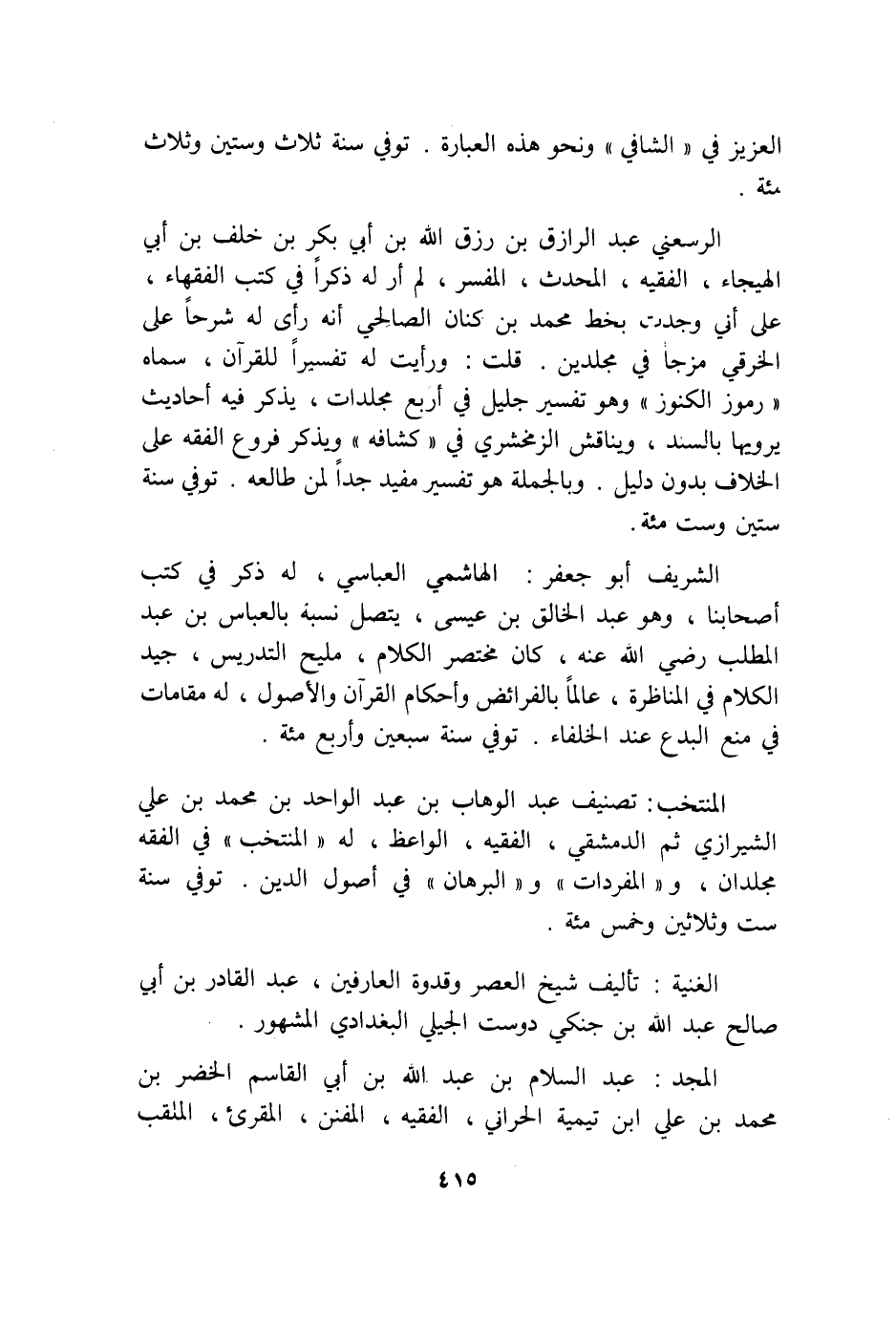 الرستغني عبد الرَّزَّاق بن رزق الله ابْن أبي بكر بن خلف ابْن أبي الهيجاء الْفَقِيه الْمُحدث الْمُفَسّر لم أر لَهُ ذكرا فِي كتب الْفُقَهَاء على أَنِّي وجدت بِخَط مُحَمَّد ابْن كنان الصَّالِحِي أَنه رأى لَهُ شرحا على الْخرقِيّ مزجا فِي مجلدين قلت وَرَأَيْت لَهُ تَفْسِيرا لِلْقُرْآنِ سَمَّاهُ رموز الْكُنُوز وَهُوَ تَفْسِير جليل فِي أَربع مجلدات يذكر فِيهِ أَحَادِيث يَرْوِيهَا بالسند ويناقش الزَّمَخْشَرِيّ فِي كشافه وَيذكر فروع الْفِقْه على الْخلاف بِدُونِ دَلِيل وَبِالْجُمْلَةِ هُوَ تَفْسِير مُفِيد جدا لمن طالعه