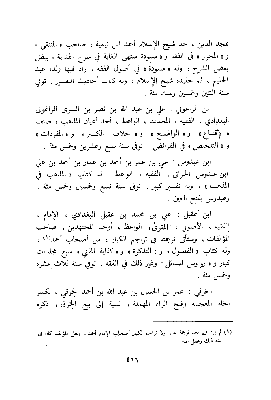 الإِمَام الْفَقِيه الأصولي الْمقري الْوَاعِظ أوحد الْمُجْتَهدين صَاحب المؤلفات وَسَتَأْتِي تَرْجَمته فِي تراجم الْكِبَار من أَصْحَاب أَحْمد وَله كتاب الْفُصُول والتذكرة وكفاية الْمُفْتِي سبع مجلدات كبار ورؤوس الْمسَائِل وَغير ذَلِك فِي الْفِقْه