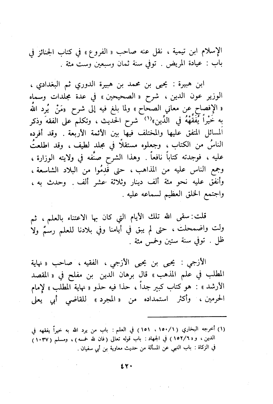 ابْن هُبَيْرَة يحيى بن مُحَمَّد بن هُبَيْرَة الدوري ثمَّ الْبَغْدَادِيّ الْوَزير عون الدّين شرح الصَّحِيحَيْنِ فِي عدَّة مجلدات وَسَماهُ الإفصاح عَن مَعَاني الصِّحَاح وَلما بلغ فِيهِ إِلَى شرح من يرد الله بِهِ خيرا يفقهه فِي الدّين شرح الحَدِيث وَتكلم على الْفِقْه وَذكر الْمسَائِل الْمُتَّفق عَلَيْهَا والمختلف فِيهَا بَين الْأَئِمَّة الْأَرْبَعَة وَقد أفرده النَّاس من الْكتاب وجعلوه مُسْتقِلّا فِي مُجَلد لطيف وَقد اطَّلَعت عَلَيْهِ فَوَجَدته كتابا نَافِعًا وَهَذَا الشَّرْح صنفه فِي ولَايَته الوزارة وَجمع النَّاس عَلَيْهِ من الْمذَاهب حَتَّى قدمُوا من الْبِلَاد الشاسعة وَأنْفق عَلَيْهِ نَحْو مائَة ألف دِينَار وَثَلَاثَة عشر ألف وَحدث بِهِ وَاجْتمعَ الْخلق الْعَظِيم لسماعه عَلَيْهِ
