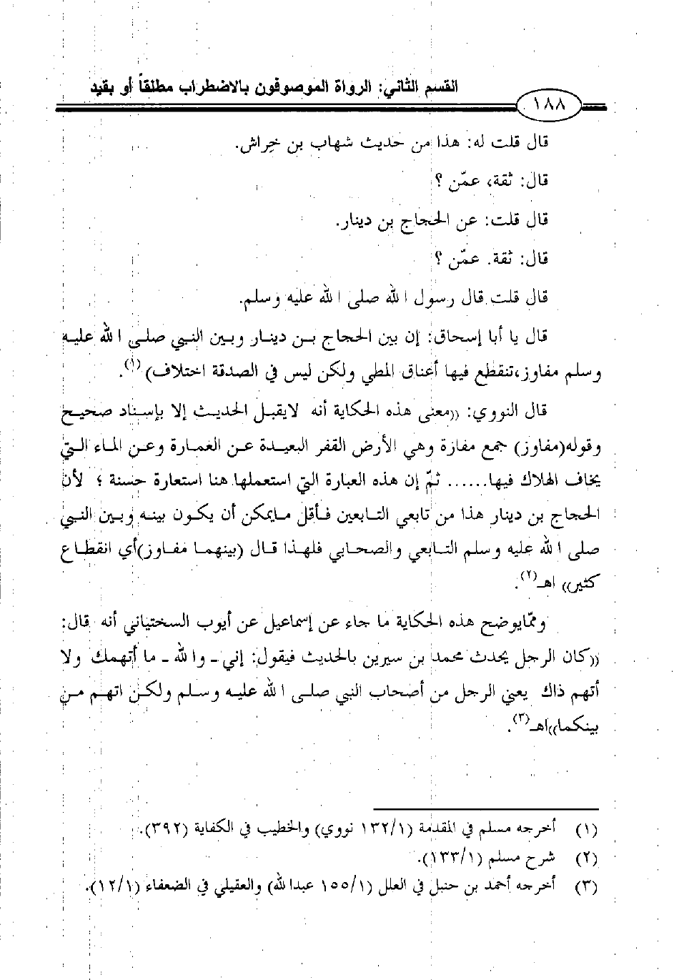 قال النووي: "معنى هذه الحكاية أنه لايقبل الحديث إلا بإسناد صحيح وقوله (مفاوز) جمع مفازة وهي الأرض القفر البعيدة عن العمارة وعن الماء التي يخاف الهلاك فيها...... ثمّ إن هذه العبارة التي استعملها هنا استعارة حسنة؛ لأن الحجاج ابن دينار هذا من تابعي التابعين فأقل مايمكن أن يكون بينه وبين النبي صلى الله عليه وسلم التابعي والصحابي فلهذا قال (بينهما مفاوز) أي انقطاع كثير" اه2.