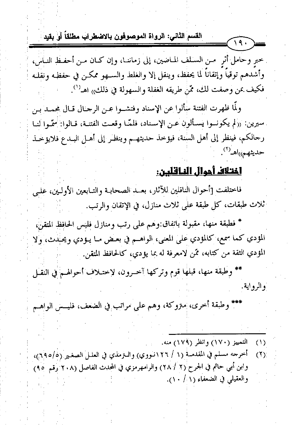 فاختلفت [أحوال الناقلين للآثار، بعد الصحابة والتابعين الأولين، على ثلاث طبقات، كل طبقة على ثلاث منازل، في الإتقان والرتب.