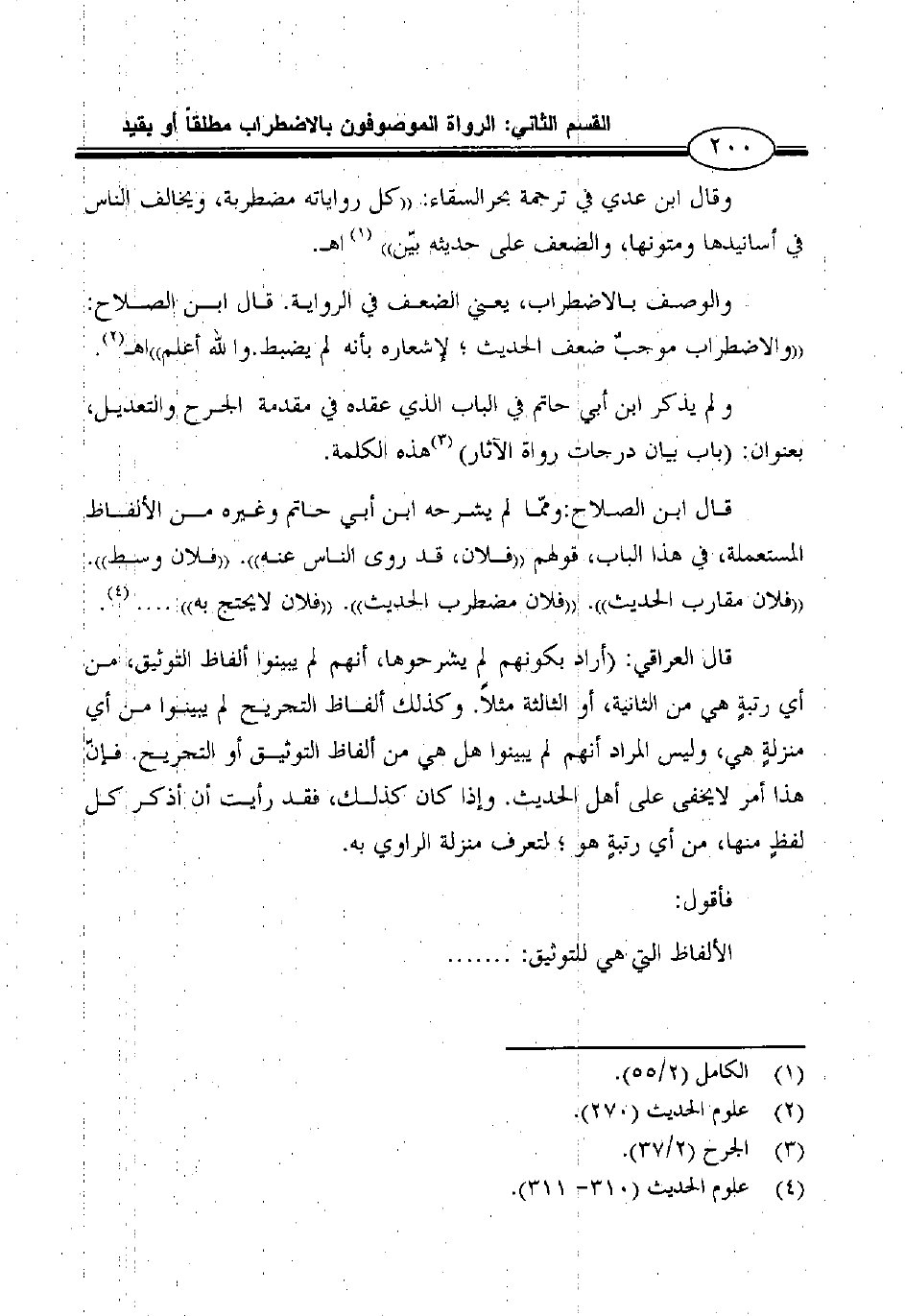 قال ابن الصلاح: وممّا لم يشرحه ابن أبي حاتم وغيره من الألفاظ المستعملة، في هذا الباب، قولهم "فلان، قد روى الناس عنه". "فلان وسط". "فلان مقارب الحديث". "فلان مضطرب الحديث". "فلان لايحتج به".... 4.