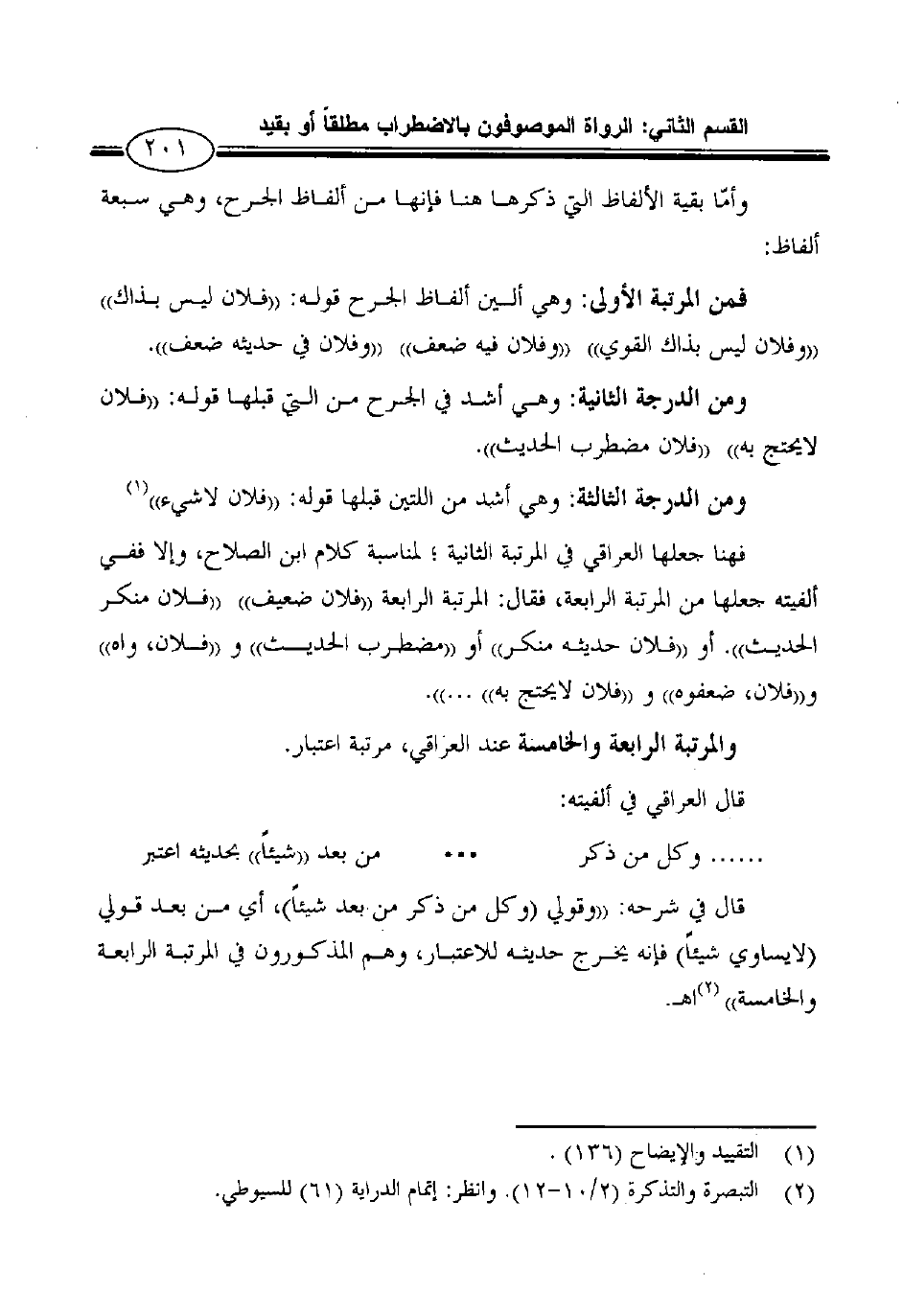 فهنا جعلها العراقي في المرتبة الثانية؛ لمناسبة كلام ابن الصلاح، وإلا ففي ألفيته جعلها من المرتبة الرابعة، فقال: المرتبة الرابعة "فلان ضعيف" "فلان منكر الحديث". أو "فلان حديثه منكر" أو "مضطرب الحديث" و "فلان، واه" و"فلان، ضعفوه" و "فلان لايحتج به" ... ".