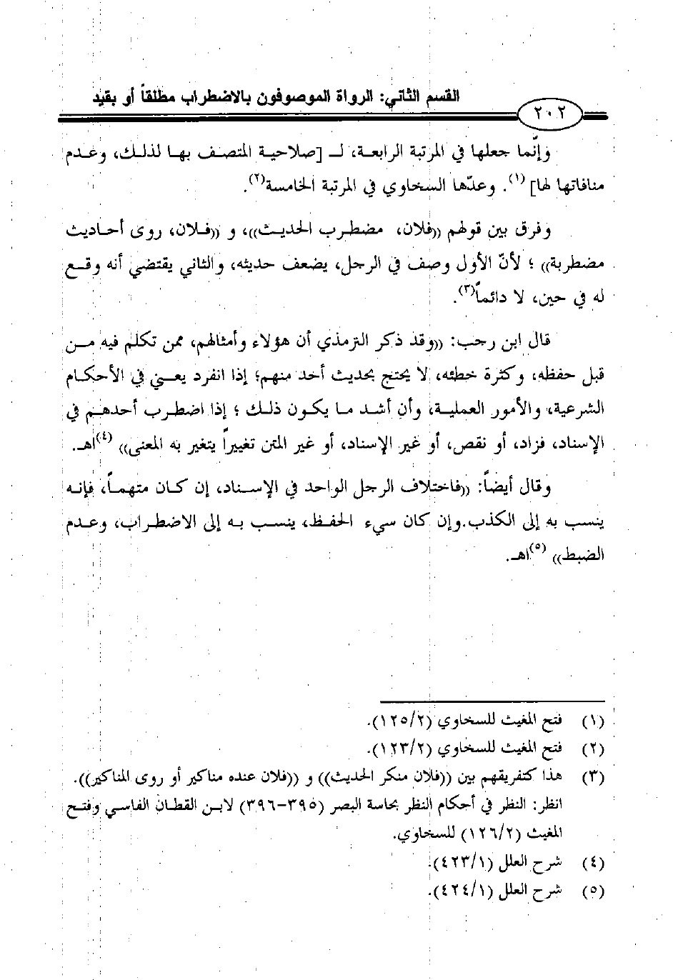 وفرق بين قولهم "فلان، مضطرب الحديث"، و "فلان، روى أحاديث مضطربة"؛ لأنّ الأول وصف في الرجل، يضعف حديثه، والثاني يقتضي أنه وقع له في حين، لا دائماً3.