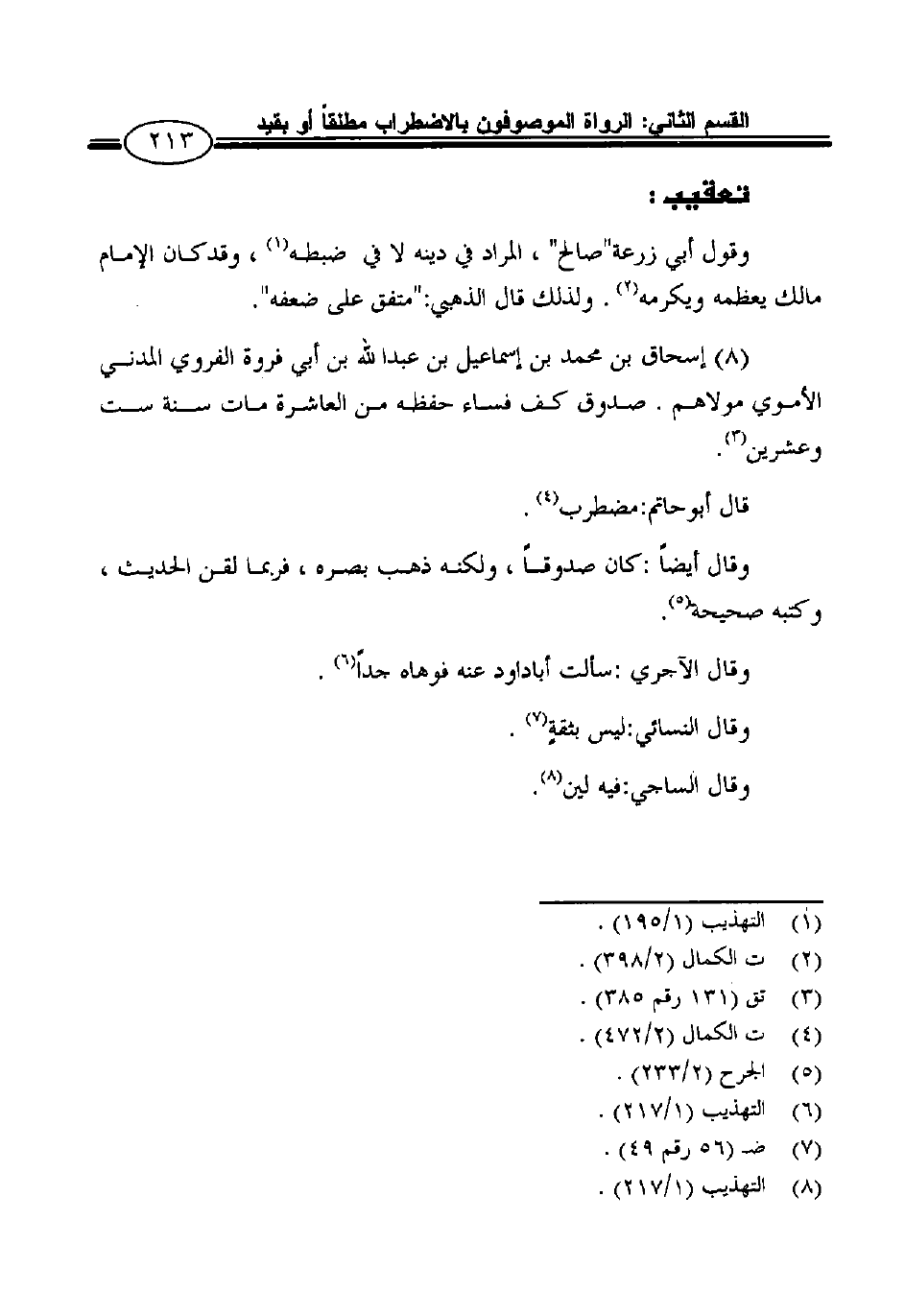 (8) إسحاق بن محمد بن إسماعيل بن عبد الله بن أبي فروة الفروي المدني الأموي مولاهم. صدوق كف فساء حفظه من العاشرة مات سنة ست وعشرين3.