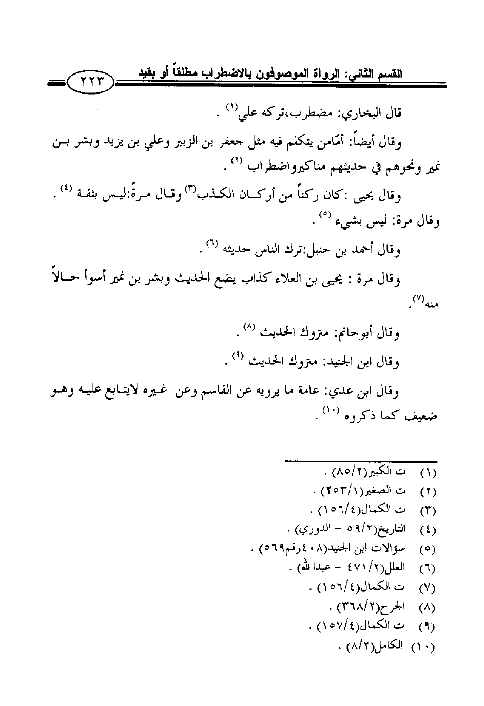 وقال أيضاً: أمّامن يتكلم فيه مثل جعفر بن الزبير وعلي بن يزيد وبشر بن نمير ونحوهم في حديثهم مناكيرواضطراب 2.