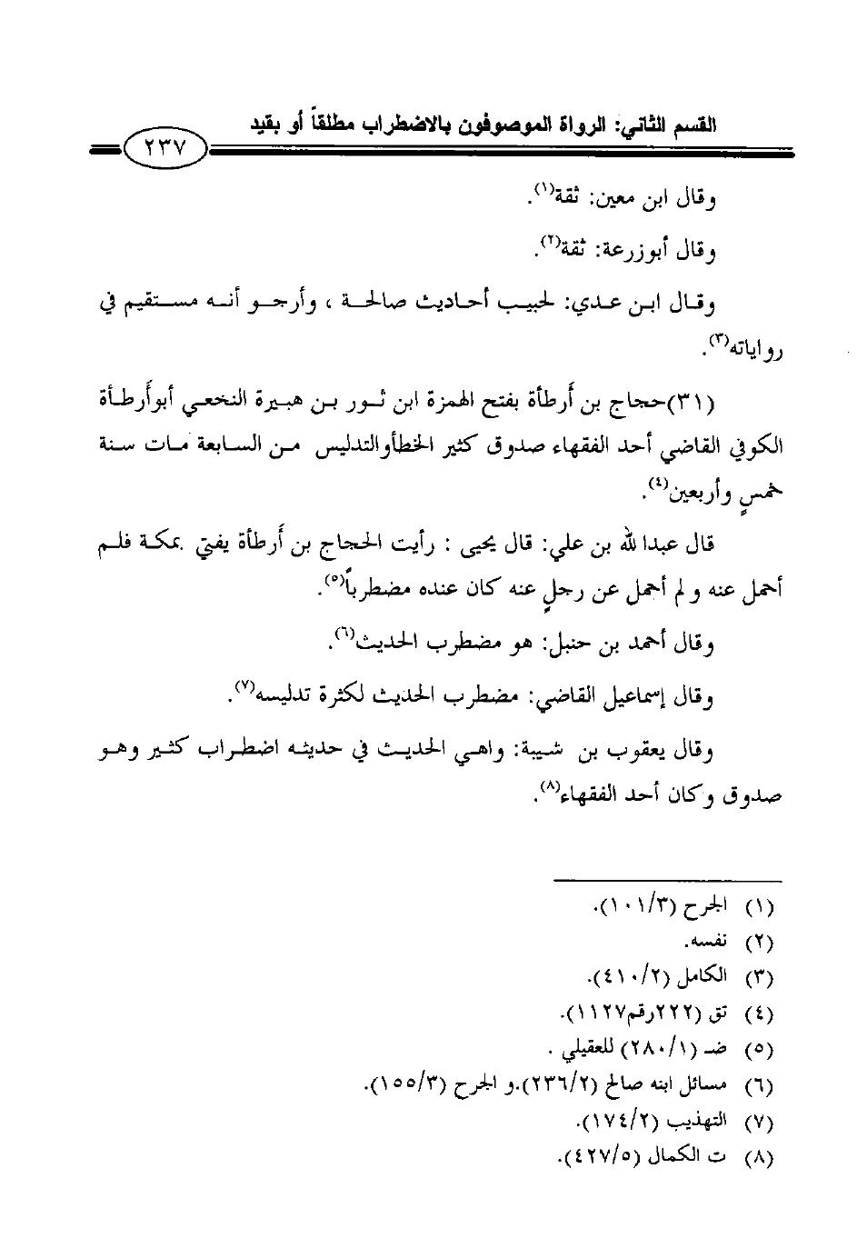 (31) حجاج بن أَرطأة بفتح الهمزة ابن ثور بن هبيرة النخعي أبو أَرطأة الكوفي القاضي أحد الفقهاء صدوق كثير الخطأوالتدليس من السابعة مات سنة خمسٍ وأربعين4.