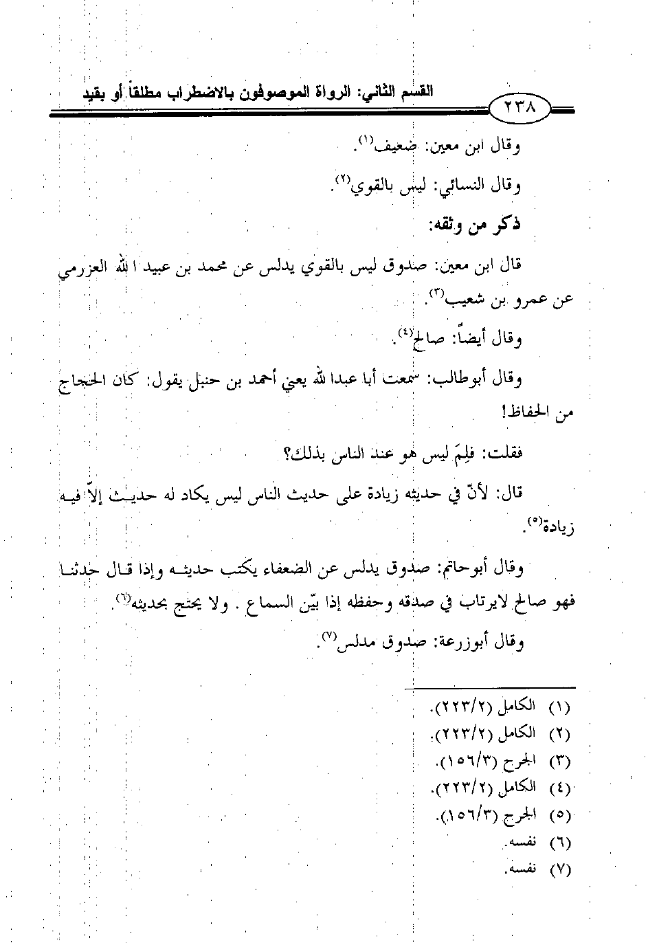 قال ابن معين: صدوق ليس بالقوي يدلس عن محمد بن عبيد الله العزرمي عن عمرو بن شعيب3.
