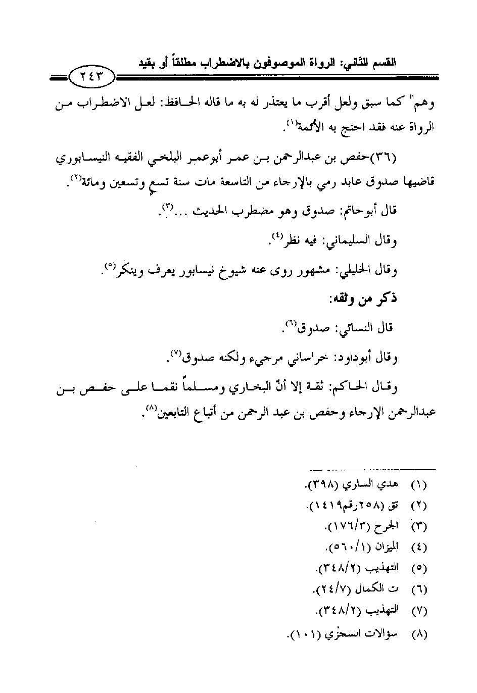 (36) حفص بن عبد الرحمن بن عمر أبوعمر البلخي الفقيه النيسابوري قاضيها صدوق عابد رمي بالإرجاء من التاسعة مات سنة تسعٍ وتسعين ومائة2.