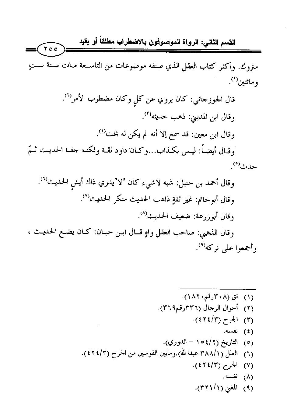 وقال الذهبي: صاحب العقل واهٍ قال ابن حبان: كان يضع الحديث، وأجمعوا على تركه9.