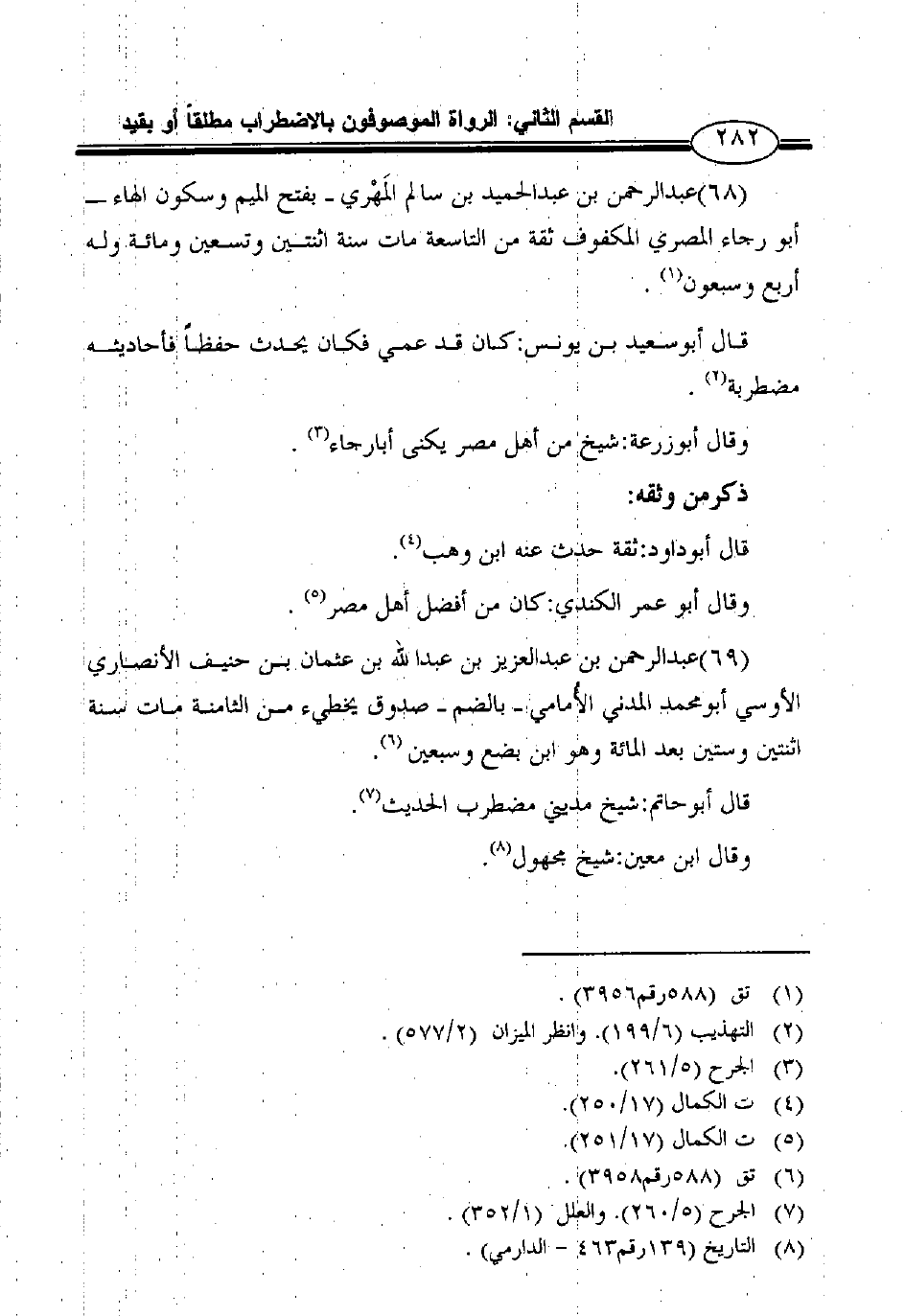 (69) عبد الرحمن بن عبد العزيز بن عبد الله بن عثمان بن حنيف الأنصاري الأوسي أبو محمد المدني الأُمامي بالضم صدوق يخطيء من الثامنة مات سنة اثنتين وستين بعد المائة وهو ابن بضع وسبعين 6.