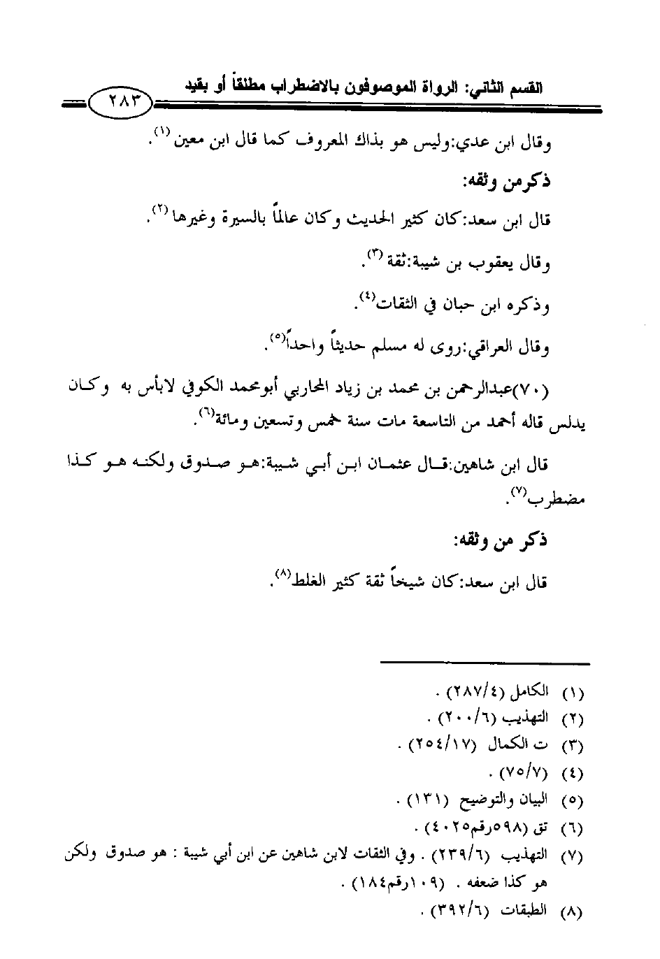 7 التهذيب (6/239) . وفي الثقات لابن شاهين عن ابن أبي شيبة: هو صدوق ولكن هو كذا ضعفه. (109رقم184) .