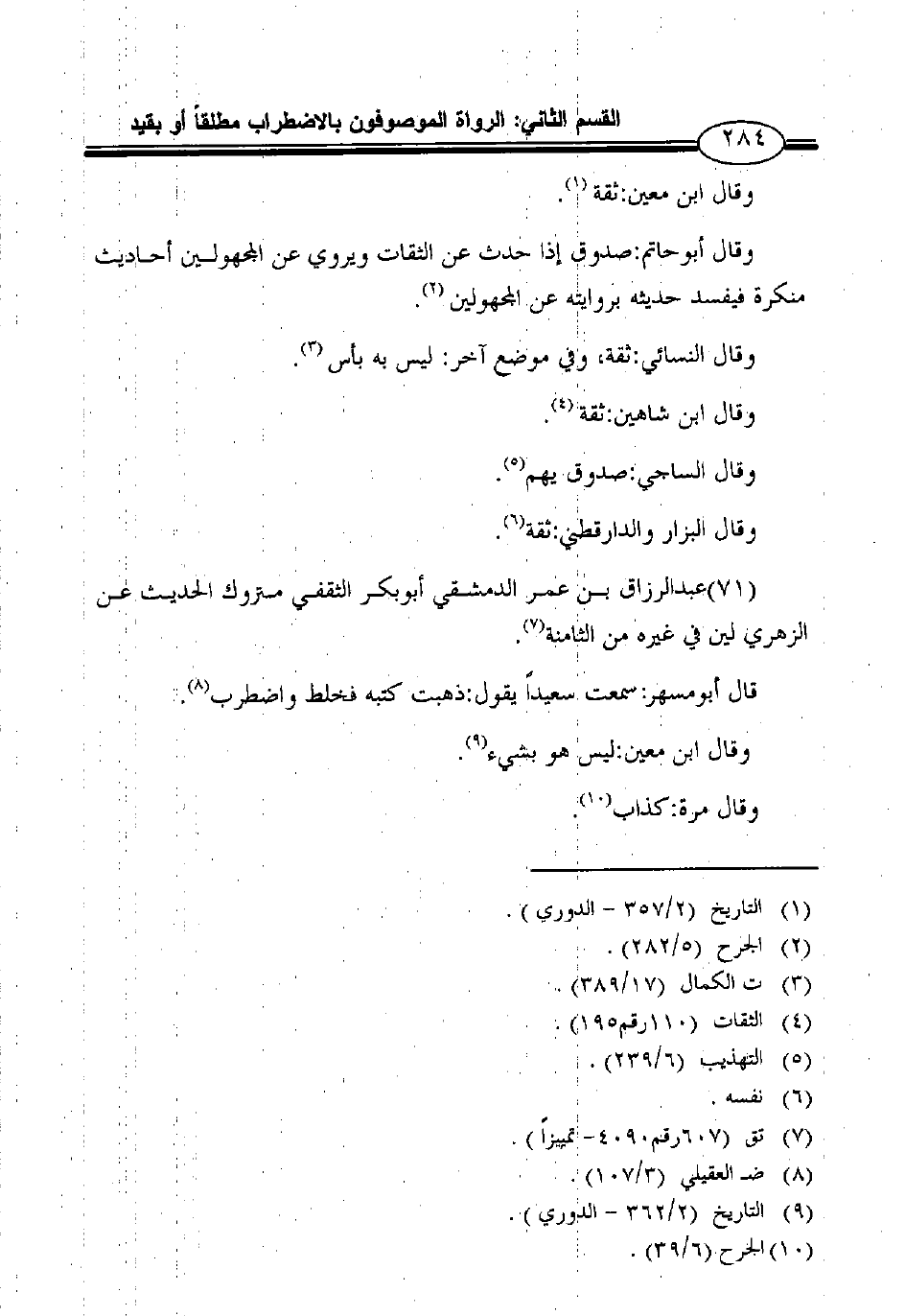 (71) عبد الرزاق بن عمر الدمشقي أبو بكر الثقفي متروك الحديث عن الزهري لين في غيره من الثامنة7.