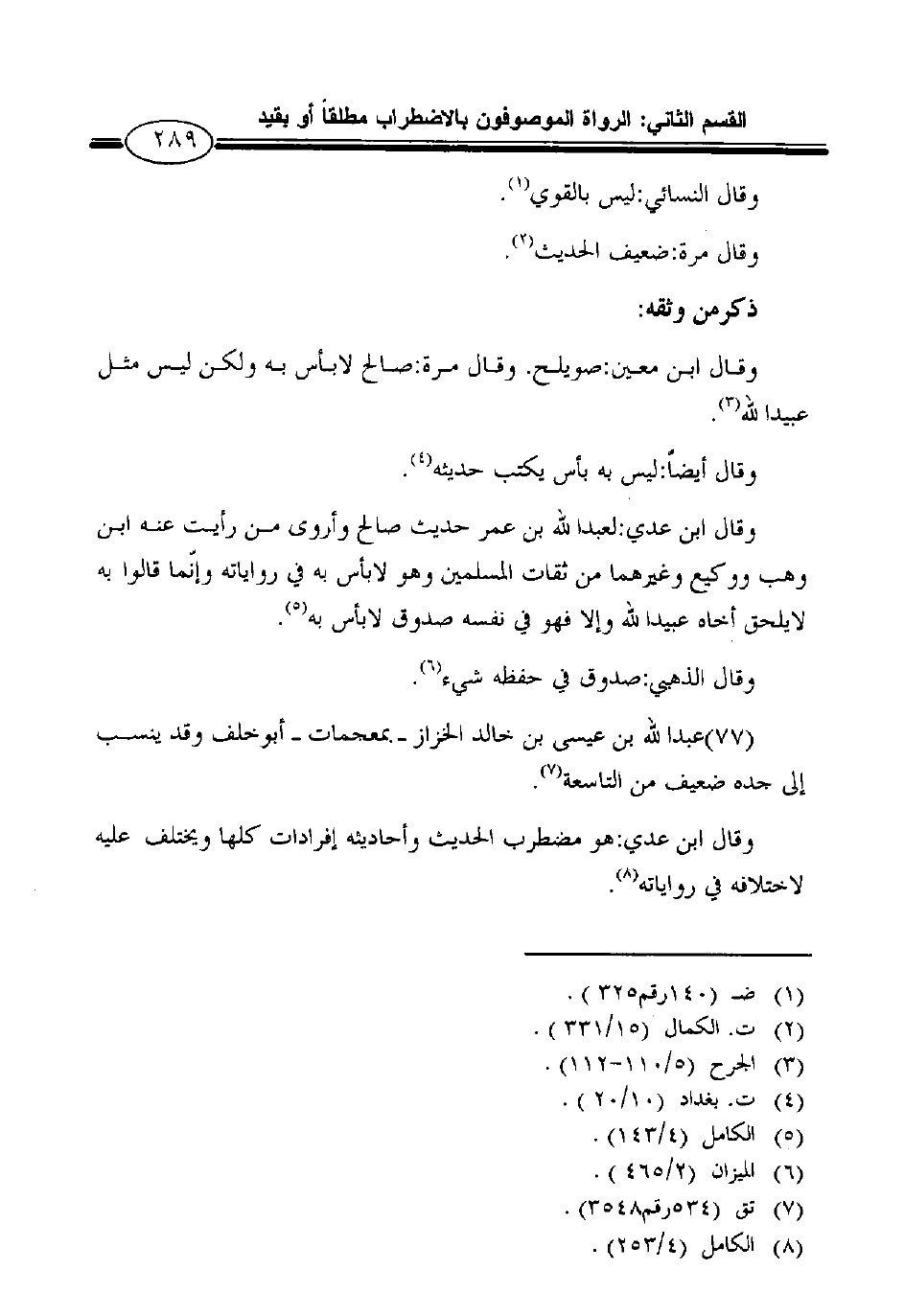 وقال ابن عدي: لعبد الله بن عمر حديث صالح وأروى من رأيت عنه ابن وهب ووكيع وغيرهما من ثقات المسلمين وهو لابأس به في رواياته وإنّما قالوا به لايلحق أخاه عبيد الله وإلا فهو في نفسه صدوق لابأس به5.
