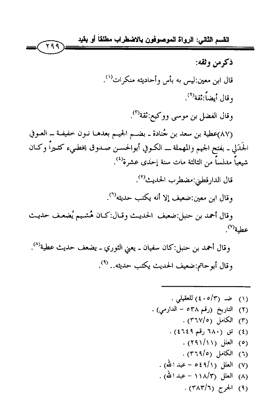 (87) عطية بن سعد بن جُنادة بضم الجيم بعدها نون خفيفة العوفي الجَدَلي بفتح الجيم والمهملة الكوفي أبو الحسن صدوق يخطيء كثيراً وكان شيعياً مدلساً من الثالثة مات سنة إحدى عشرة4.