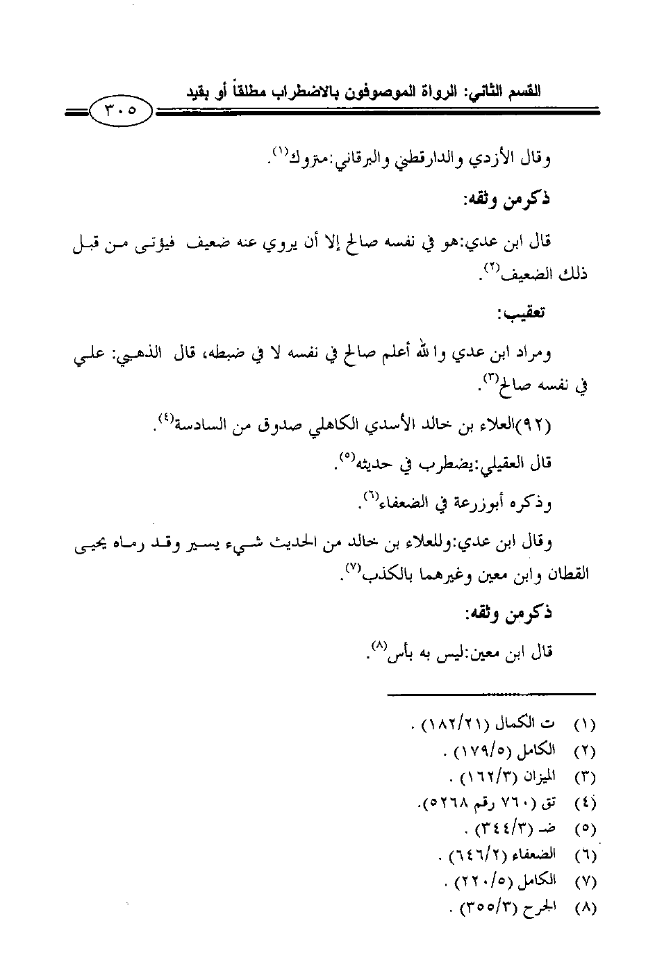 وقال ابن عدي: وللعلاء بن خالد من الحديث شيء يسير وقد رماه يحيى القطان وابن معين وغيرهما بالكذب7.