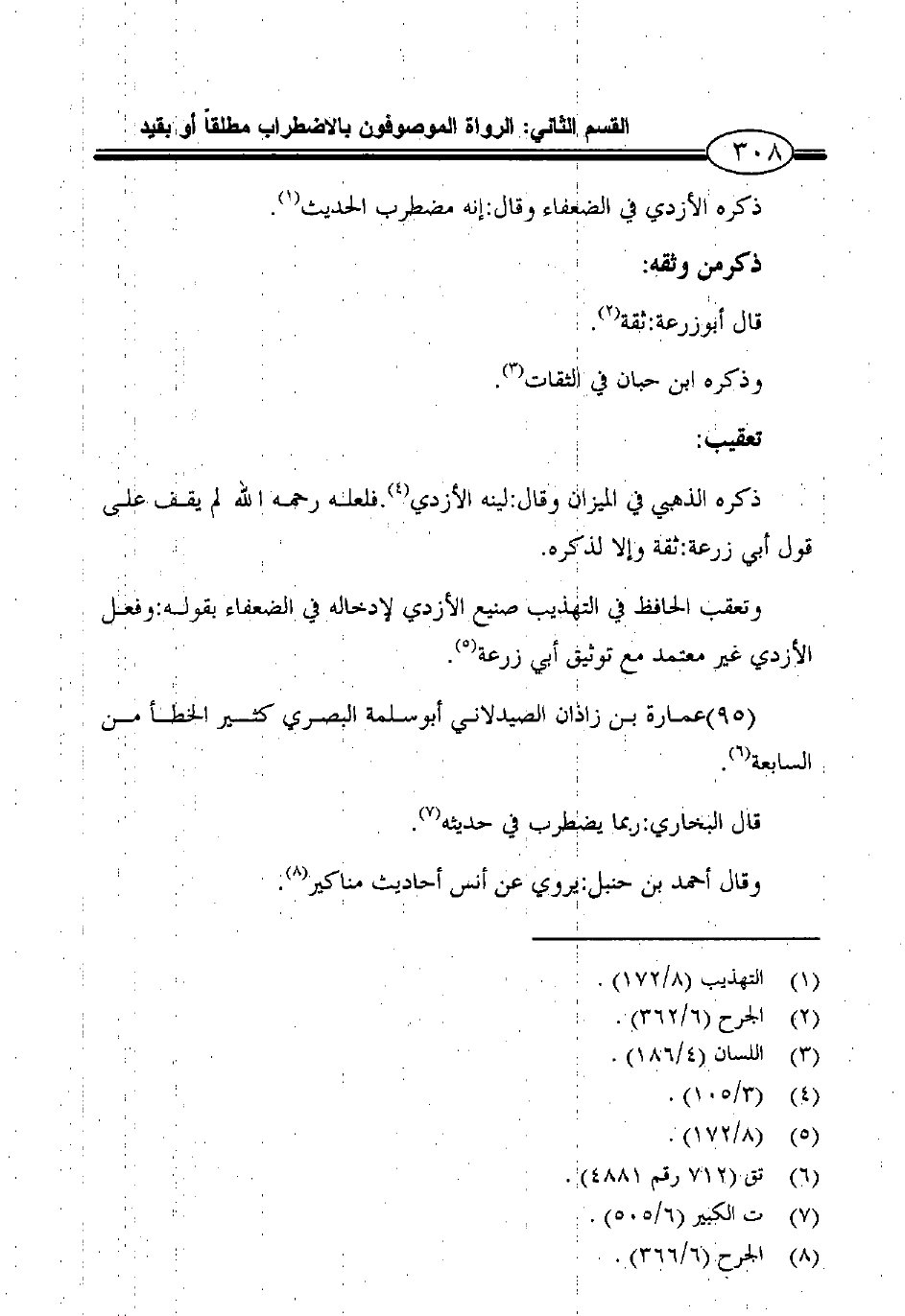وتعقب الحافظ في التهذيب صنيع الأزدي لإدخاله في الضعفاء بقوله: وفعل الأزدي غير معتمد مع توثيق أبي زرعة5.