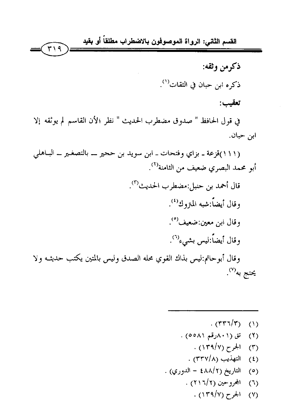 في قول الحافظ "صدوق مضطرب الحديث" نظر؛لأن القاسم لم يوثقه إلا ابن حبان.