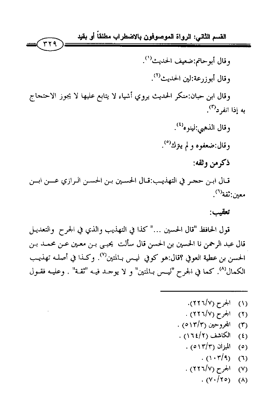 قول الحافظ "قال الحسين ... " كذا في التهذيب والذي في الجرح والتعديل قال عبد الرحمن نا الحسين بن الحسن قال سألت يحيى بن معين عن محمد بن الحسن بن عطية العوفي؟ قال: هو كوفي ليس بالمتين7. وكذا في أصله تهذيب الكمال8. كما في الجرح "ليس بالمتين" ولا يوجد فيه "ثقة". وعليه فقول