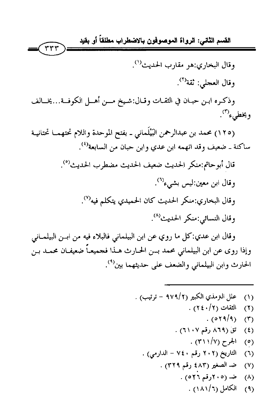 (125) محمد بن عبد الرحمن البَيْلَماني بفتح الموحدة واللام تحتهما تحتانية ساكنة ضعيف وقد اتهمه ابن عدي وابن حبان من السابعة4.