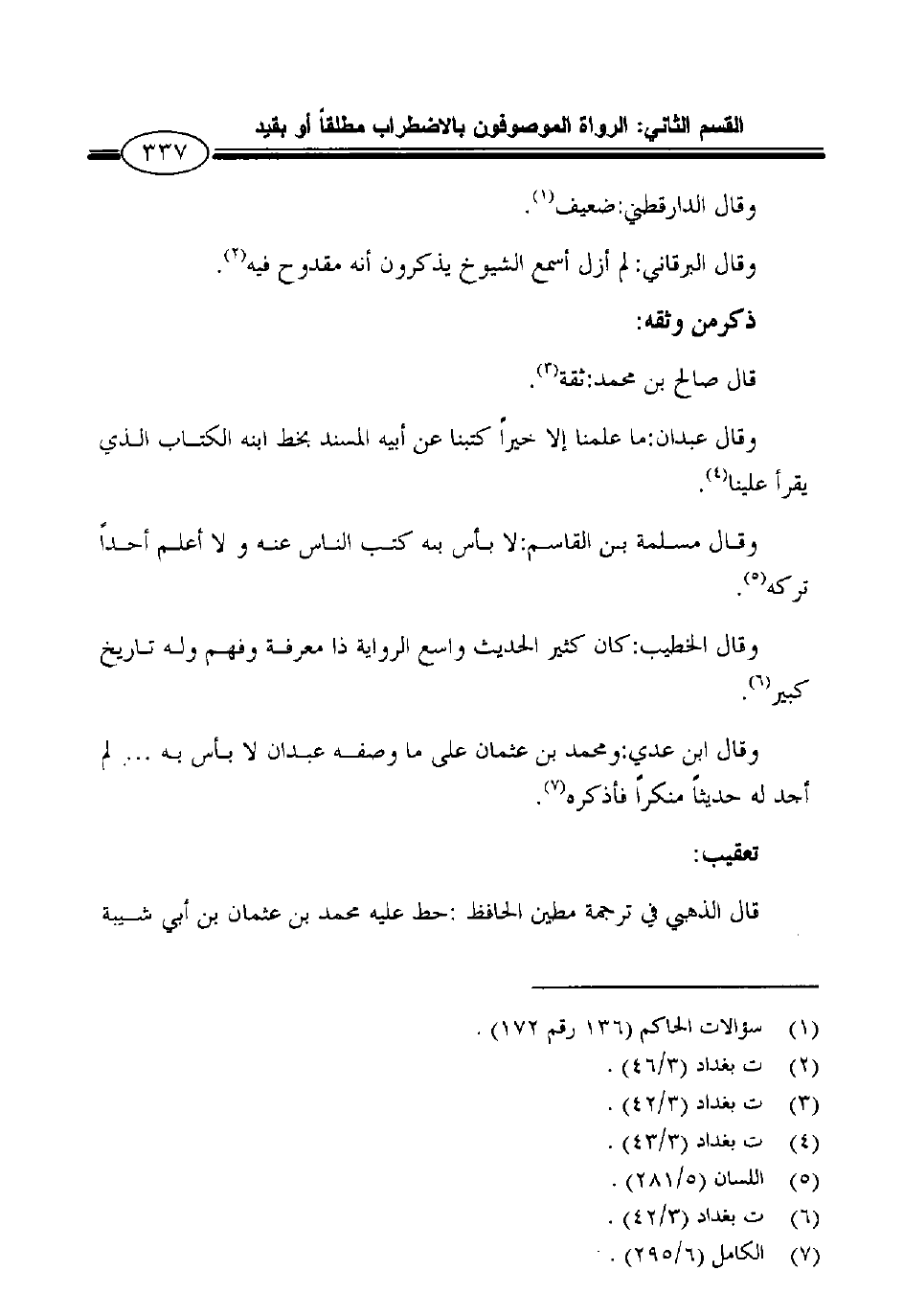 وقال ابن عدي: ومحمد بن عثمان على ما وصفه عبد ان لا بأس به ... لم أجد له حديثاً منكراً فأذكره7.