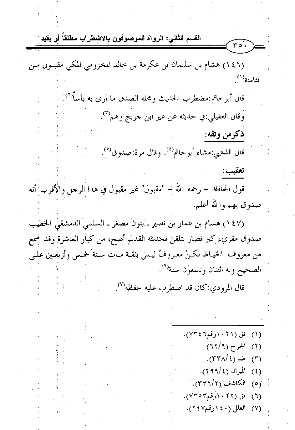 (147) هشام بن عمار بن نصير بنون مصغر السلمي الدمشقي الخطيب صدوق مقريء كبر فصار يتلقن فحديثه القديم أصح من كبار العاشرة وقد سمع من معروف الخياط لكن معروف ليس بثقة مات سنة خمس وأربعين على الصحيح وله اثنتان وتسعون سنة6.