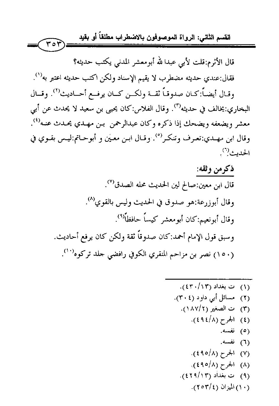 وقال أيضاً: كان صدوقاً ثقة ولكن كان يرفع أحاديث2. وقال البخاري: يخالف في حديثه3. وقال الفلاس: كان يحيى بن سعيد لا يحدث عن أبي معشر ويضعفه ويضحك إذا ذكره وكان عبد الرحمن بن مهدي يحدث عنه4. وقال ابن مهدي: تعرف وتنكر5. وقال ابن معين وأبو حاتم: ليس بقوي في الحديث6.