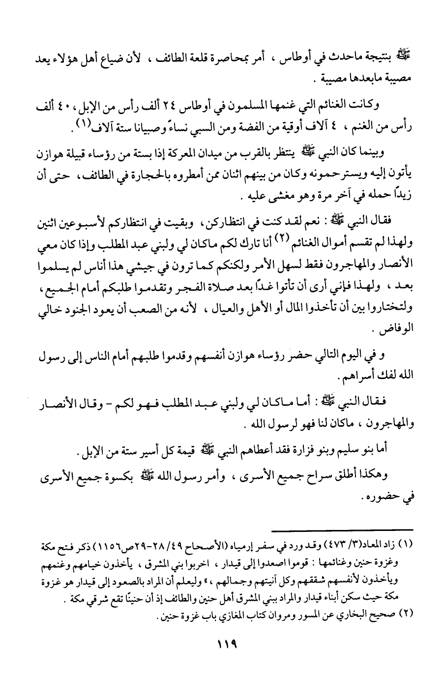 فقال النبي - صلى الله عليه وسلم -: نعم لقد كنت في انتظاركن، وبقيت في انتظاركم لأسبوعين اثنين ولهذا لم تقسم أموال الغنائم (¬2) أنا تارك لكم ما كان لي ولبني عبد المطلب وإذا كان معي الأنصار والمهاجرون فقط لسهل الأمر ولكنكم كما ترون في جيشي هذا أناس لم يسلموا بعد، ولهذا فإني أرى أن تأتوا غدا بعد صلاة الفجر وتقدموا طلبكم أمام الجميع، ولتختاروا بين أن تأخذوا المال أو الأهل والعيال، لأنه من الصعب أن يعود الجنود خالي الوفاض.
