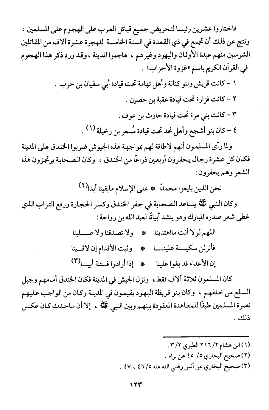 وكان النبي - صلى الله عليه وسلم - يساعد الصحابة في حفر الخندق وكسر الحجارة ورفع التراب الذي غطى شعر صدره المبارك وهو ينشد أبياتا لعبد الله بن رواحة: