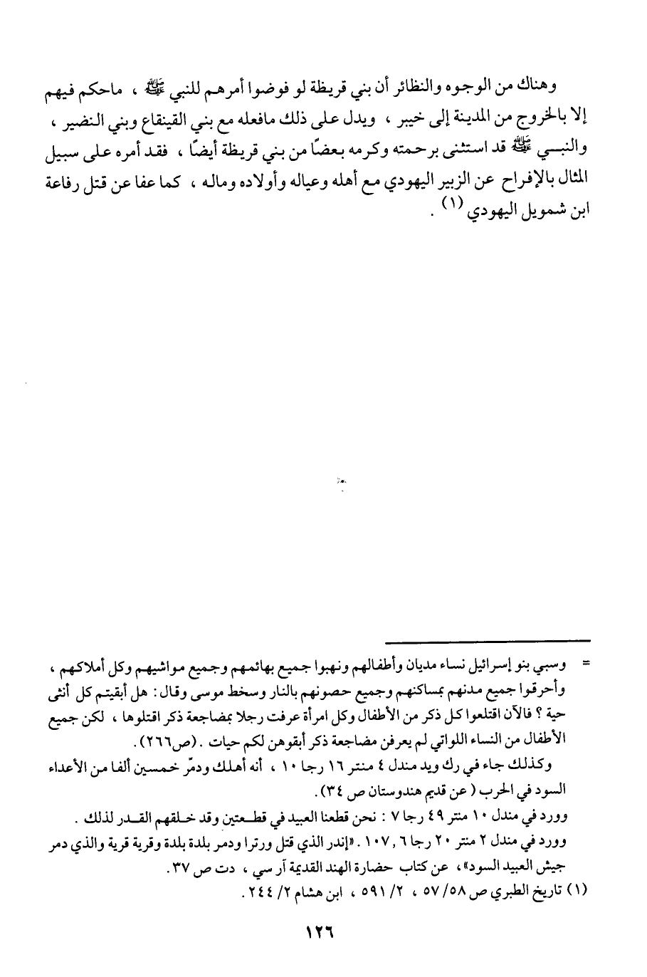وهناك من الوجوه والنظائر أن بني قريظة لو فوضوا أمرهم للنبي - صلى الله عليه وسلم -، ما حكم فيهم إلا بالخروج من المدينة إلى خيبر، ويدل على ذلك ما فعله مع بني القينقاع وبني النضير، والنبي - صلى الله عليه وسلم - قد استثنى برحمته وكرمه بعضا من بني قريظة أيضا، فقد أمره على سبيل المثال بالإفراج عن الزبير اليهودي مع أهله وعياله وأولاده وماله، كما عفا عن قتل رفاعة ابن شمويل اليهودي (¬1).