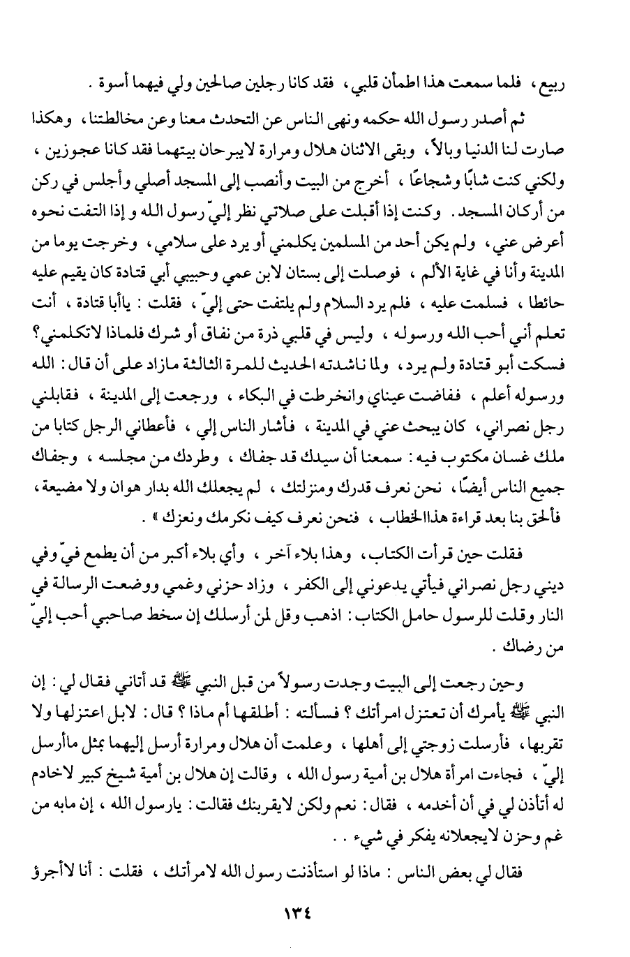 وحين رجعت إلى البيت وجدت رسولا من قبل النبي - صلى الله عليه وسلم - قد أتاني فقال لي: إن النبي - صلى الله عليه وسلم - يأمرك أن تعتزل امرأتك؟ فسألته: أطلقها أم ماذا؟ قال: لا بل اعتزلها ولا تقربها، فأرسلت زوجتي إلى أهلها، وعلمت أن هلال ومرارة أرسل إليهما بمثل ما أرسل إلي، فجاءت امرأة هلال بن أمية رسول الله، وقالت إن هلال بن أمية شيخ كبير لا خادم له أتأذن لي في أن أخدمه، فقال: نعم ولكن لا يقربنك فقالت: يا رسول الله، إن ما به من غم وحزن لا يجعلانه يفكر في شيء ..