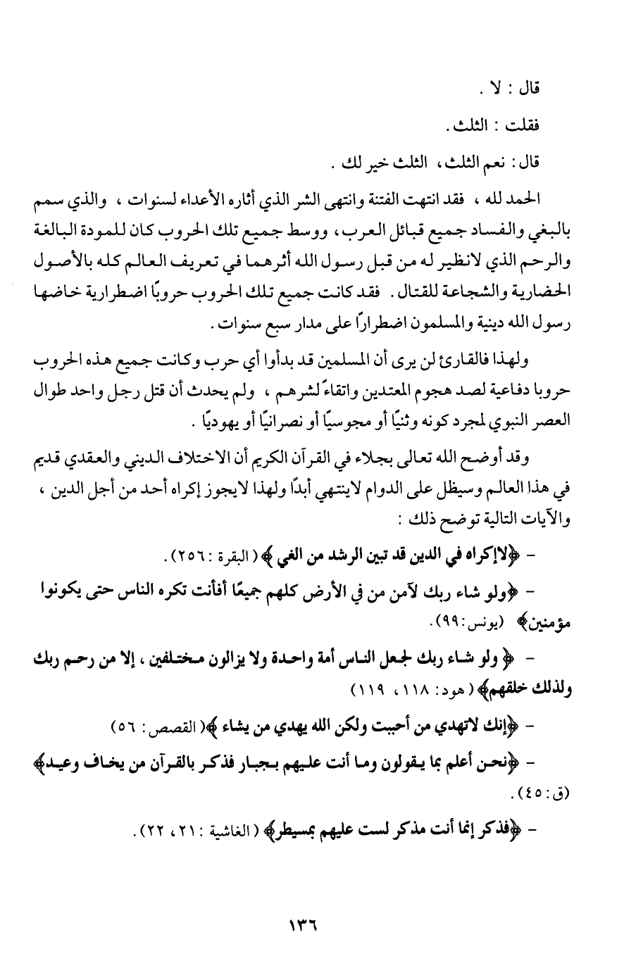 ولهذا فالقارئ لن يرى أن المسلمين قد بدأوا أي حرب وكانت جميع هذه الحروب حروبا دفاعية لصد هجوم المعتدين واتقاء لشرهم، ولم يحدث أن قتل رجل واحد طوال العصر النبوي لمجرد كونه وثنيا أو مجوسيا أو نصرانيا أو يهوديا.