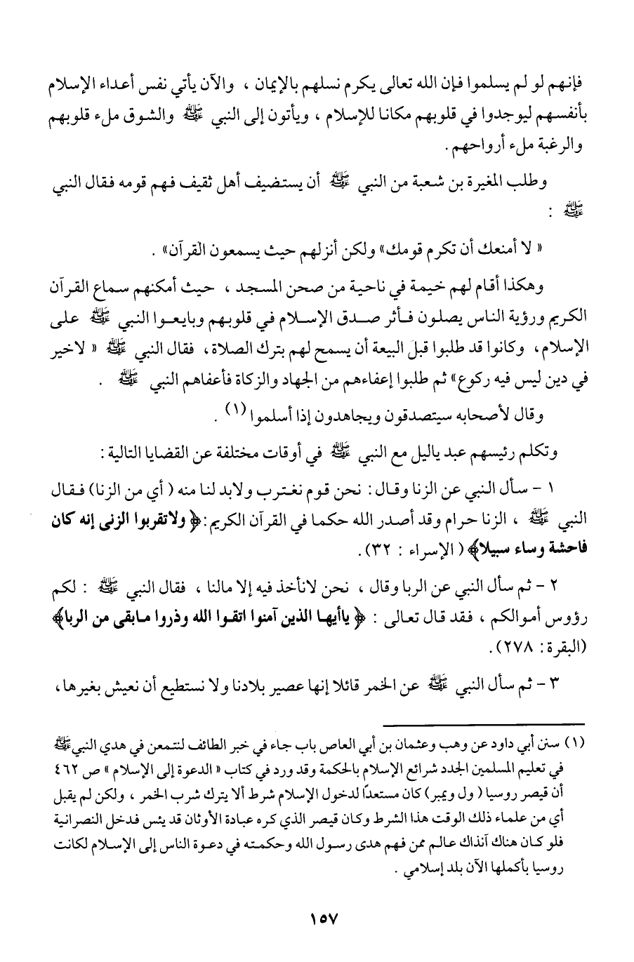 (¬1) سنن أبي داود عن وهب وعثمان بن أبي العاص باب جاء في خبر الطائف لنتمعن في هدي النبي - صلى الله عليه وسلم - في تعليم المسلمين الجدد شرائع الإسلام بالحكمة وقد ورد في كتاب "الدعوة إلى الإسلام" [ص:462] أن قيصر روسيا (ول ويمبر) كان مستعدا لدخول الإسلام شرط ألا يترك شرب الخمر، ولكن لم يقبل أي من علماء ذلك الوقت هذا الشرط وكان قيصر الذي كره عبادة الأوثان قد يئس فدخل النصرانية فلو كان هناك آنذاك عالم ممن فهم هدي رسول الله وحكمته في دعوة الناس إلى الإسلام لكانت روسيا بأكملها الآن بلد إسلامي.