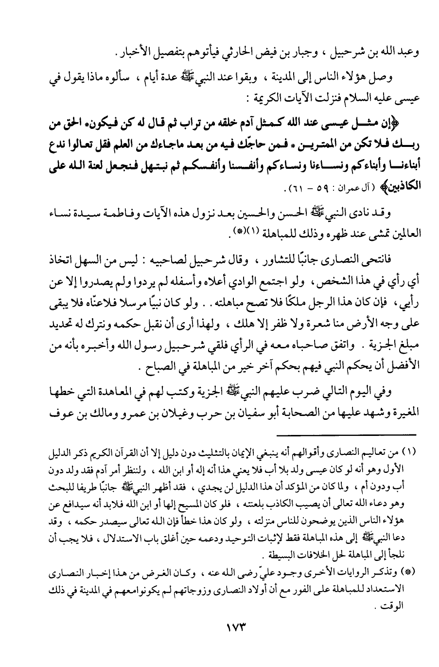 (¬1) من تعاليم النصارى وأقوالهم أنه ينبغي الإيمان بالتثليث دون دليل إلا أن القرآن الكريم ذكر الدليل الأول وهو أنه لو كان عيسى ولد بلا أب فلا يعني هذا أنه إله أو ابن الله، ولننظر أمر آدم فقد ولد دون أب ودون أم، ولما كان من المؤكد أن هذا الدليل لن يجدي، فقد أظهر النبي - صلى الله عليه وسلم - جانبا طريفا للبحث وهو دعاء الله تعالى أن يصيب الكاذب بلعنته، فلو كان المسيح إلها أو ابن الله فلا بد أنه سيدافع عن هؤلاء الناس الذين يوضحون للناس منزلته، ولو كان هذا خطأ فإن الله تعالى سيصدر حكمه، وقد دعا - صلى الله عليه وسلم - إلى هذه المباهلة فقط لإثبات التوحيد ودعمه حين أغلق باب الاستدلال، فلا يجب أن نلجأ إلى المباهلة لحل الخلافات البسيطة.