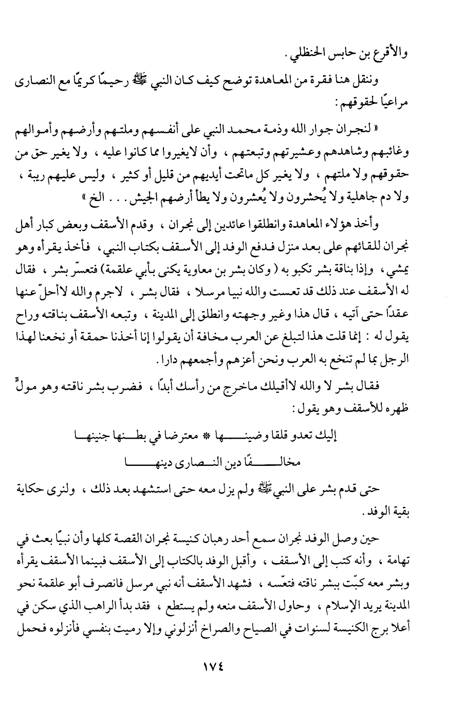 "لنجران جوار الله وذمة محمد النبي على أنفسهم وملتهم وأرضهم وأموالهم وغائبهم وشاهدهم وعشيرتهم وتبعتهم، وأن لا يغيروا مما كانوا عليه، ولا يغير حق من حقوقهم ولا ملتهم، ولا يغير كل ما تحت أيديهم من قليل أو كثير، وليس عليهم ريبة، ولا دم جاهلية ولا يحشرون ولا يعشرون ولا يطأ أرضهم الجيش ... الخ"