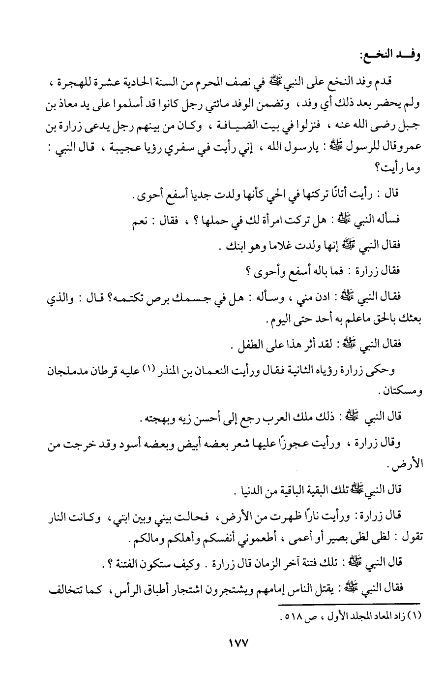 قدم وفد النخع على النبي - صلى الله عليه وسلم - في نصف المحرم من السنة الحادية عشرة للهجرة، ولم يحضر بعد ذلك أي وفد، وتضمن الوفد مائتي رجل كانوا قد أسلموا على يد معاذ بن جبل رضي الله عنه، فنزلوا في بيت الضيافة، وكان من بينهم رجل يدعى زرارة بن عمرو قال للرسول - صلى الله عليه وسلم -: يا رسول الله، إني رأيت في سفري رؤيا عجيبة، قال النبي: وما رأيت؟