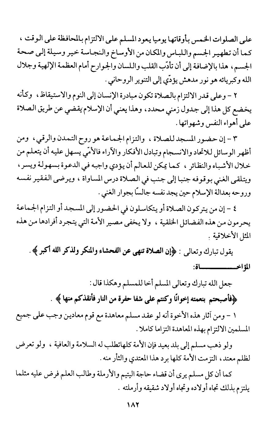 3 - إن حضور المسجد للصلاة، والتزام الجماعة هو روح التمدن والرقي، ومن أظهر الوسائل للاتحاد والانسجام وتبادل الأفكار والآراء فالأمي يسهل عليه أن يتعلم من خلال الأشباه والنظائر، كما يمكن للعالم أن يؤدي واجبه في الدعوة بسهولة ويسر، ويتلقى الغني بوقوفه جنبا إلى جنب في الصلاة درس المساواة، ويرضى الفقير نفسه وروحه بعدالة الإسلام حين يجد نفسه جالسا بجوار الغني.