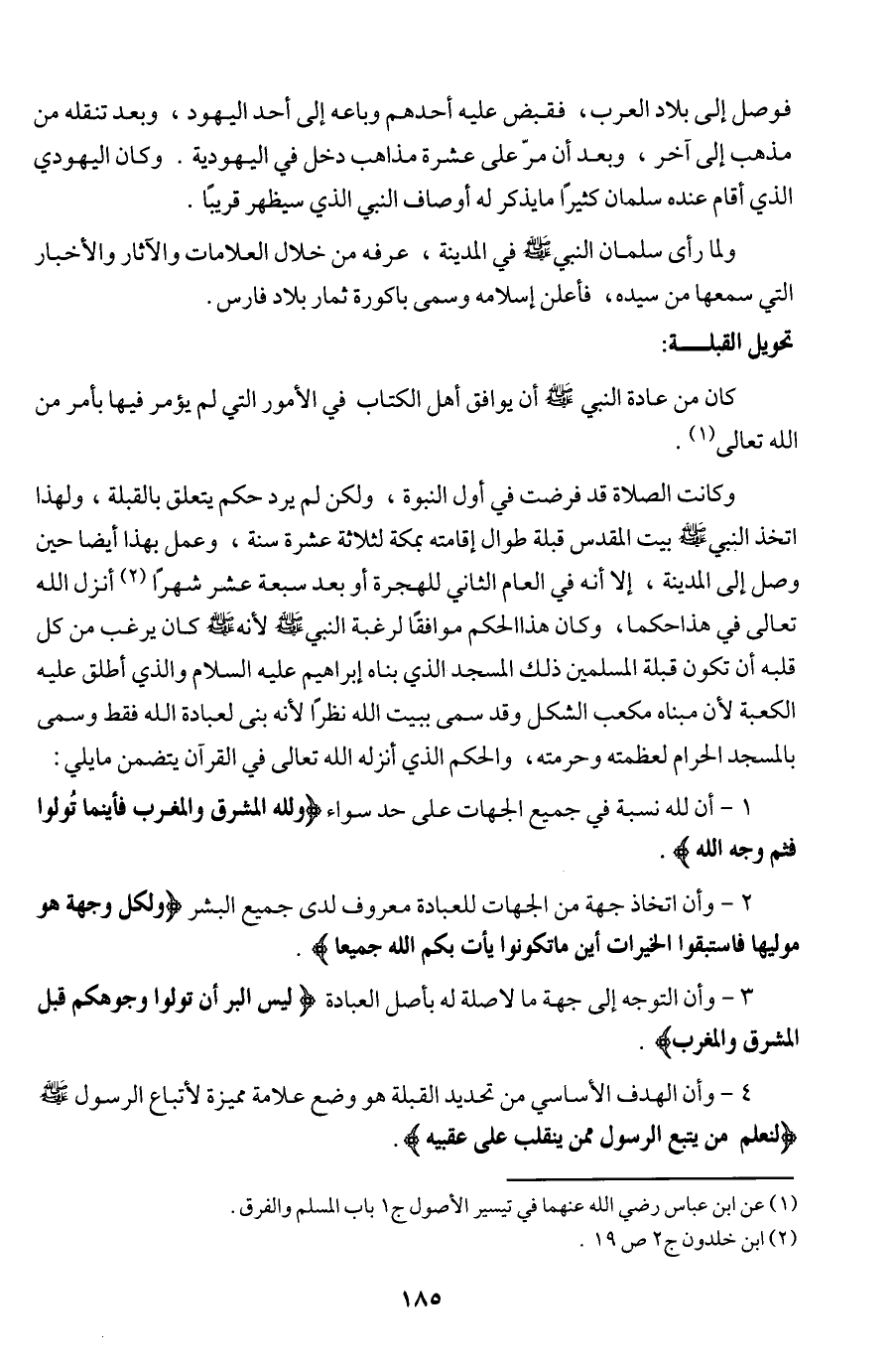 وكانت الصلاة قد فرضت في أول النبوة، ولكن لم يرد حكم يتعلق بالقبلة، ولهذا اتخذ النبي - صلى الله عليه وسلم - بيت المقدس قبلة طوال إقامته بمكة لثلاثة عشرة سنة، وعمل بهذا أيضا حين وصل إلى المدينة، إلا أنه في العام الثاني للهجرة أو بعد سبعة عشر شهرا (¬2) أنزل الله تعالى في هذا حكما، وكان هذا الحكم موافقا لرغبة النبي - صلى الله عليه وسلم - لأنه - صلى الله عليه وسلم - كان يرغب من كل قلبه أن تكون قبلة المسلمين ذلك المسجد الذي بناه إبراهيم عليه السلام والذي أطلق عليه الكعبة لأن مبناه مكعب الشكل وقد سمى ببيت الله نظرا لأنه بني لعبادة الله فقط وسمى بالمسجد الحرام لعظمته وحرمته، والحكم الذي أنزله الله تعالى في القرآن يتضمن ما يلي: