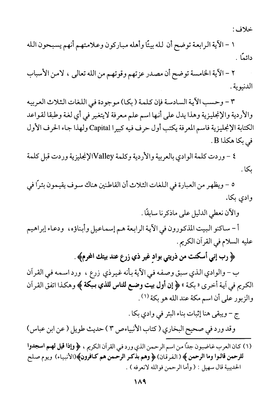 ب - والوادي الذي سبق وصفه في الآية بأنه غير ذي زرع، ورد اسمه في القرآن الكريم في آية أخرى "بكة" {إن أول بيت وضع للناس للذي ببكة} وهكذا اتفق القرآن والزبور على أن اسم مكة عند الله هو بكة (¬1).