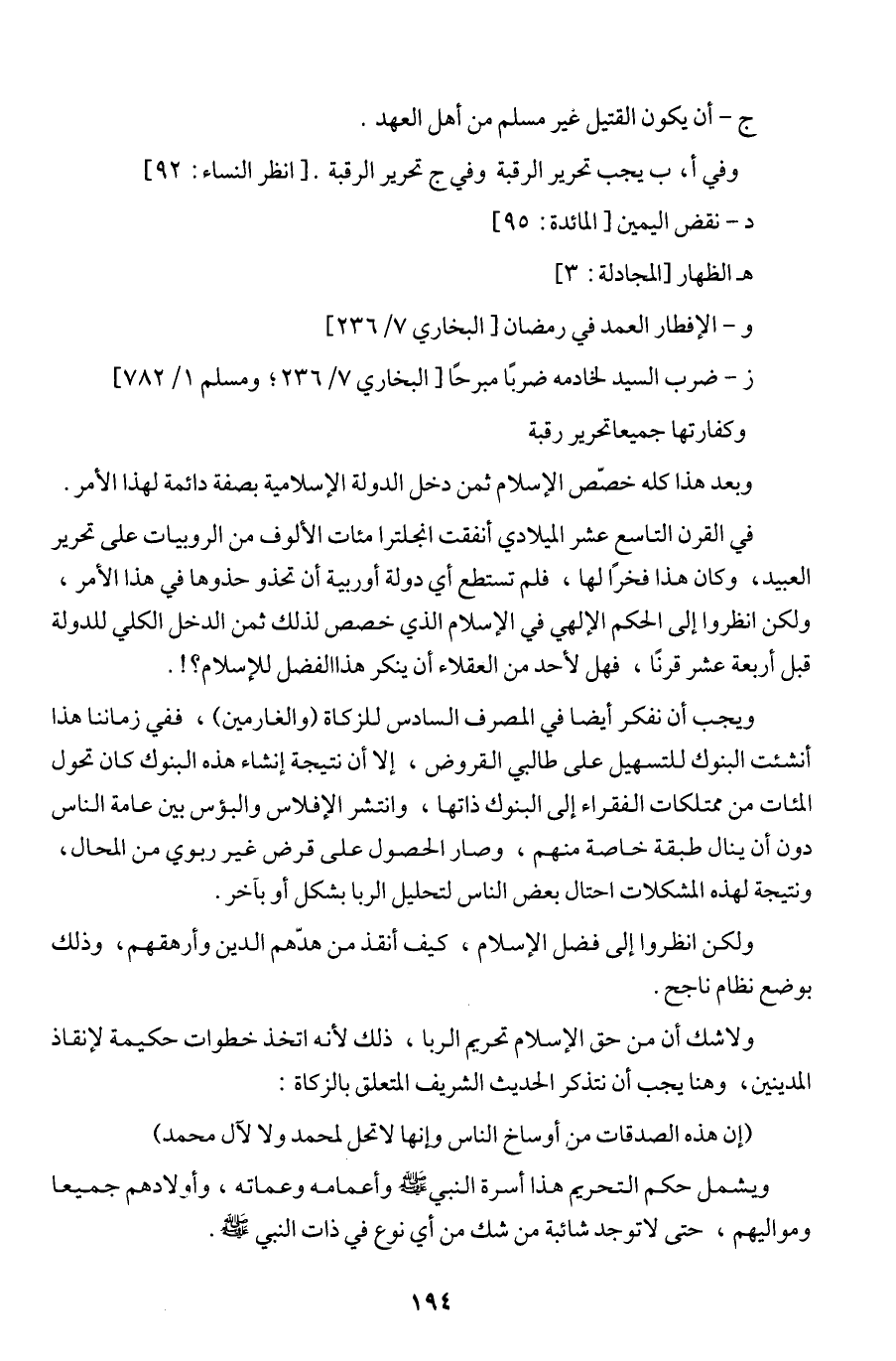 ولاشك أن من حق الإسلام تحريم الربا، ذلك لأنه اتخذ خطوات حكيمة لإنقاذ المدينين، وهنا يجب أن نتذكر الحديث الشريف المتعلق بالزكاة: