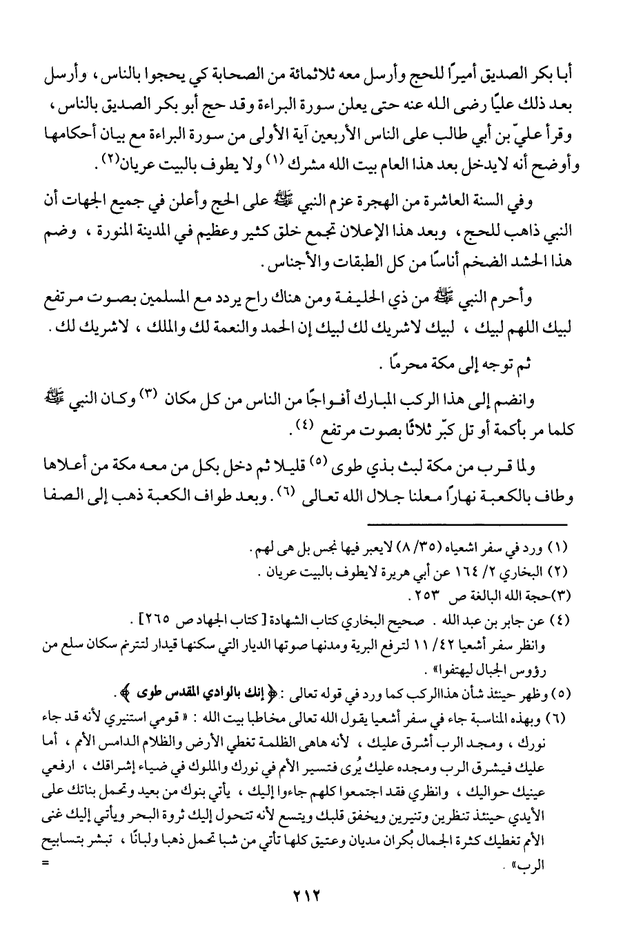 وأحرم النبي - صلى الله عليه وسلم - من ذي الحليفة ومن هناك راح يردد مع المسلمين بصوت مرتفع لبيك اللهم لبيك، لبيك لا شريك لك لبيك إن الحمد والنعمة لك والملك، لا شريك لك. ثم توجه إلى مكة محرما.