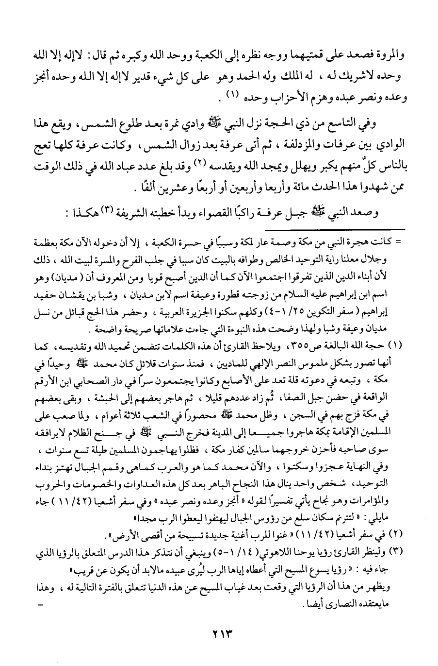 (¬1) حجة الله البالغة [ص:355]، ويلاحظ القارئ أن هذه الكلمات تتضمن تحميد الله وتقديسه، كما أنها تصور بشكل ملموس النصر الإلهي للماديين، فمنذ سنوات قلائل كان محمد - صلى الله عليه وسلم - وحيدا في مكة، وتبعه في دعوته قلة تعد على الأصابع وكانوا يجتمعون سرا في دار الصحابي ابن الأرقم الواقعة في حضن جبل الصفا، ثم زاد عددهم قليلا، ثم هاجر بعضهم إلى الحبشة، وبقي بعضهم في مكة فزج بهم في السجن، وظل محمد - صلى الله عليه وسلم - محصورا في الشعب ثلاثة أعوام، ولما صعب على المسلمين الإقامة بمكة هاجروا جميعا إلى المدينة فخرج النبي - صلى الله عليه وسلم - في جنح الظلام لا يرافقه سوى صاحبه فأحزن خروجهما سالمين كفار مكة، فظلوا يهاجمون المسلمين طيلة تسع سنوات، وفي النهاية عجزوا وسكتوا، والآن محمد كما هو والعرب كما هي وقمم الجبال تهتز بنداء التوحيد، شخص واحد ينال هذا النجاح الباهر بعد كل هذه العداوات والخصومات والحروب والمؤامرات وهو نجاح يأتي تفسيرا لقوله "أنجز وعده ونصر عبده" وفي سفر أشعيا (42/ 11) جاء ما يلي: "لتترنم سكان سلع من رؤوس الجبال ليهتفوا ليعطوا الرب مجدا".
