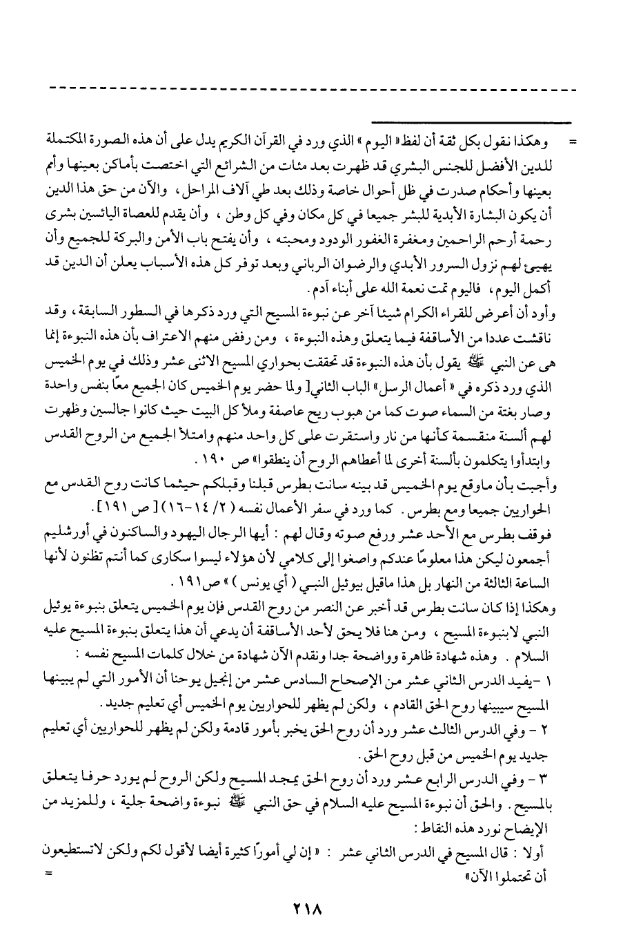 وأود أن أعرض للقراء الكرام شيئا آخر عن نبوءة المسيح التي ورد ذكرها في السطور السابقة، وقد ناقشت عددا من الأساقفة فيما يتعلق وهذه النبوءة، ومن رفض منهم الاعتراف بأن هذه النبوءة إنما هي عن النبي - صلى الله عليه وسلم - يقول بأن هذه النبوءة قد تحققت بحواري المسيح الاثنى عشر وذلك في يوم الخميس الذي ورد ذكره في "أعمال الرسل" الباب الثاني [ولما حضر يوم الخميس كان الجميع معا بنفس واحدة وصار بغتة من السماء صوت كما من هبوب ريح عاصفة وملأ كل البيت حيث كانوا جالسين وظهرت لهم ألسنة منقسمة كأنها من نار واستقرت على كل واحد منهم وامتلأ الجميع من الروح القدس وابتدأوا يتكلمون بألسنة أخرى لما أعطاهم الروح أن ينطقوا] [ص:190].