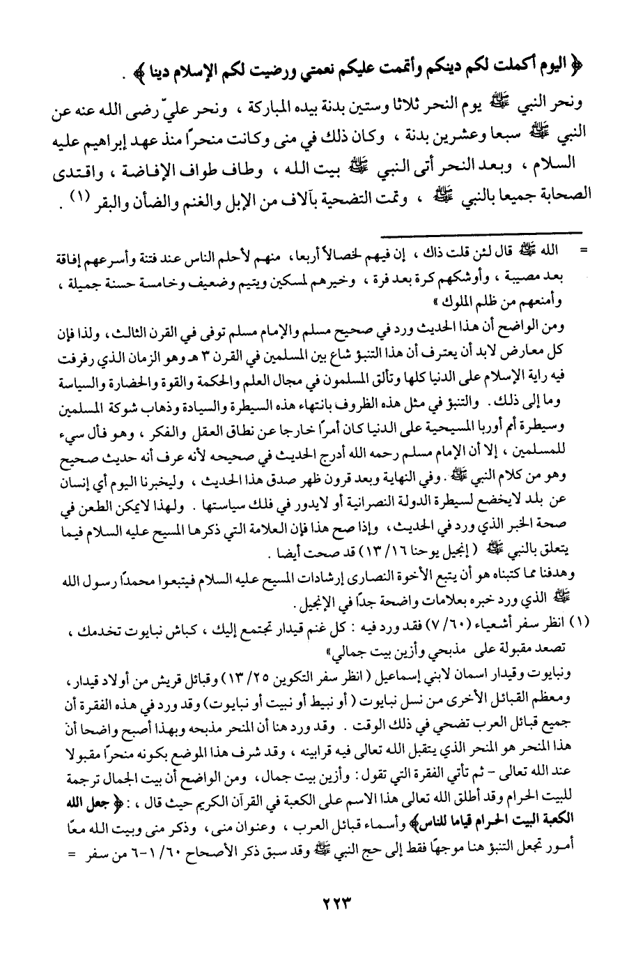ونبايوت وقيدار اسمان لابني إسماعيل (انظر سفر التكوين 25/ 13) وقبائل قريش من أولاد قيدار، ومعظم القبائل الأخرى من نسل نبايوت (أو نبيط أو نبيت أو نبايوت) وقد ورد في هذه الفقرة أن جميع قبائل العرب تضحي في ذلك الوقت. وقد ورد هنا أن المنحر مذبحه وبهذا أصبح واضحا أن هذا المنحر هو المنحر الذي يتقبل الله تعالى فيه قرابينه، وقد شرف هذا الموضع بكونه منحرا مقبولا عند الله تعالى - ثم تأتي الفقرة التي تقول: وأزين بيت جمال، ومن الواضح أن بيت الجمال ترجمة للبيت الحرام وقد أطلق الله تعالى هذا الاسم على الكعبة في القرآن الكريم حيث قال،: {جعل الله الكعبة البيت الحرام قياما للناس} وأسماء قبائل العرب، وعنوان منى، وذكر منى وبيت الله معا أمور تجعل التنبؤ هنا موجها فقط إلى حج النبي - صلى الله عليه وسلم - وقد سبق ذكر الأصحاح 60/ 1 - 6 من سفر =