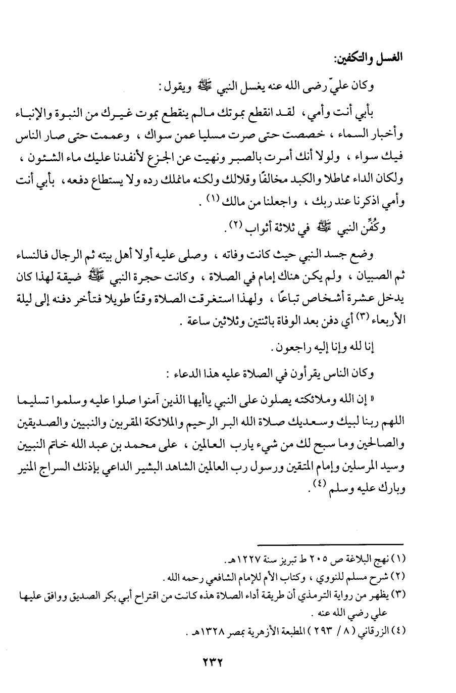 وضع جسد النبي حيث كانت وفاته، وصلى عليه أولا أهل بيته ثم الرجال فالنساء ثم الصبيان، ولم يكن هناك إمام في الصلاة، وكانت حجرة النبي - صلى الله عليه وسلم - ضيقة لهذا كان يدخل عشرة أشخاص تباعا، ولهذا استغرقت الصلاة وقتا طويلا فتأخر دفنه إلى ليلة الأربعاء (¬3) أي دفن بعد الوفاة باثنتين وثلاثين ساعة.