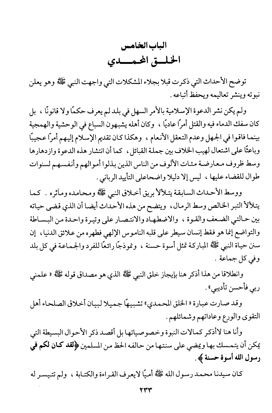 ووسط الأحداث السابقة يتلألأ بريق أخلاق النبي - صلى الله عليه وسلم - ومحامده ومآثره. كما يتلألأ التبر الخالص وسط الرمال، ويتضح من هذه الأحداث أيضا أن الذي قضى حياته بين حالتي الضعف والقوة، والاضطهاد والانتصار على وتيرة واحدة من البساطة والتواضع إنما هو فقط إنسان سيطر على قلبه الناموس الإلهي فطهره من علائق الدنيا، إن سنن حياة النبي - صلى الله عليه وسلم - المباركة تمثل أسوة حسنة، ونموذجا رائعا للفرد والجماعة في كل بلد وفي كل جماعة.