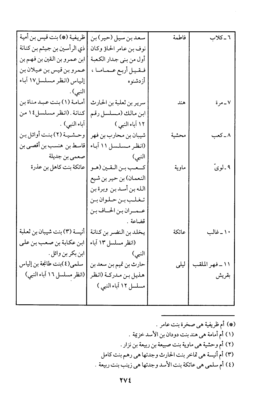 6 - كلاب ... فاطمة ... سعد بن سيل (حير) بن نوف بن عامر الحاؤ وكان أول من بنى جدار الكعبة فقيل أربع عماما، أزدشنوه ... ظريفية (*) بنت قيس بن أمية ذي الرأسين بن جيثم بن كنانة ابن عمرو بن القين بن فهم بن عمرو بن قيس بن عيلان بن إلياس (انظر مسلسل 17 آباء النبي).