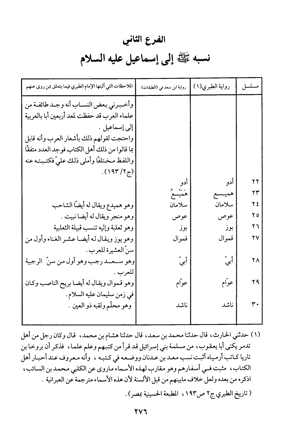 (¬1) حدثني الحارث، قال حدثنا محمد بن سعد، قال حدثنا هشام بن محمد، قال وكان رجل من أهل تدمر يكنى أبا يعقوب، من مسلمة بني إسرائيل قد قرأ من كتبهم وعلم علما، فذكر أن بروخا بن تاريا كاتب أرمياه أثبت نسب معد بن عدنان ووضعه في كتبه، وأنه معروف عند أحبار أهل الكتاب، مثبت في أسفارهم وهو مقارب لهذه الأسماء ما روى عن الكلبي محمد بن السائب، اذكره من بعده ولعل خلاف ما بينهم من قبل الألسنة لأن هذه الأسماء مترجمة عن العبرانية.