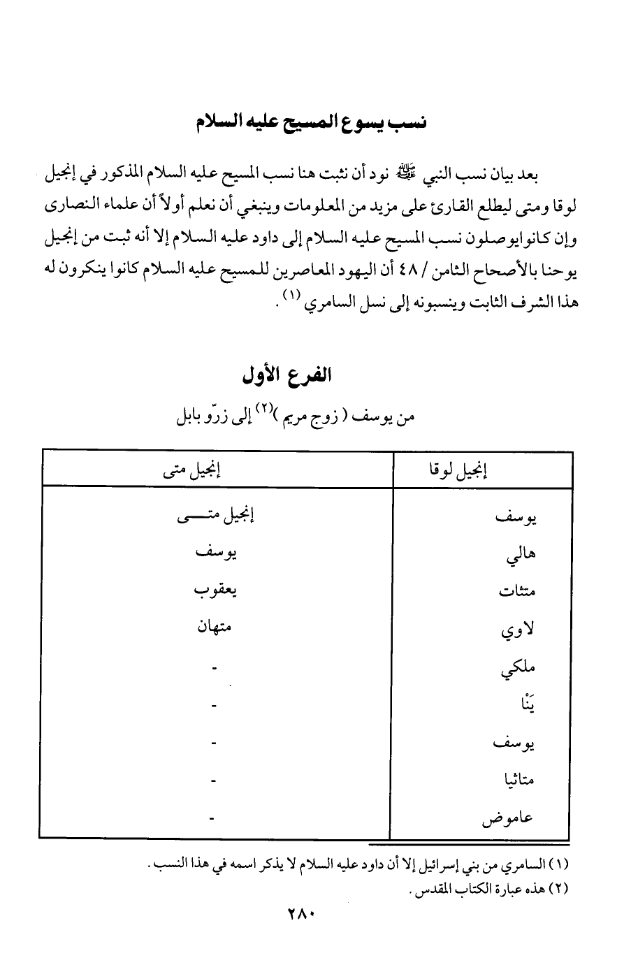 بعد بيان نسب النبي - صلى الله عليه وسلم - نود أن نثبت هنا نسب المسيح عليه السلام المذكور في إنجيل لوقا ومتى ليطلع القارئ على مزيد من المعلومات وينبغي أن نعلم أولا أن علماء النصارى وإن كانوا يوصلون نسب المسيح عليه السلام إلى داود عليه السلام إلا أنه ثبت من إنجيل يوحنا بالأصحاح الثامن / 48 أن اليهود المعاصرين للمسيح عليه السلام كانوا ينكرون له هذا الشرف الثابت وينسبونه إلى نسل السامري (¬1).